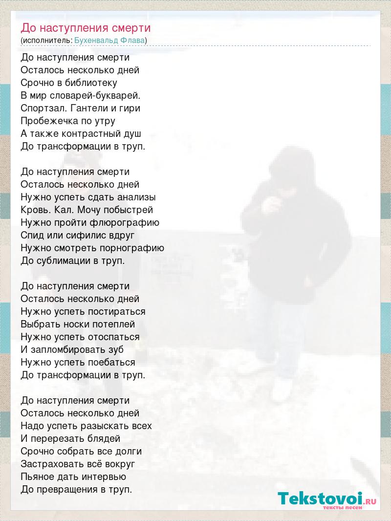 До наступления смерти Осталось несколько дней Срочно в библиотеку В мир словарей-букварей. Спортзал. Гантели и гири Пробежечка по утру А также контрастный душ До трансформации в труп. До наступления смерти Осталось несколько дней Нужно успеть сдать анализы Кровь. Кал. Мочу побыстрей Нужно пройти флюрографию Спид или сифилис вдруг Нужно смотреть порнографию До сублимации в труп. До наступления смерти Осталось несколько дней Нужно успеть постираться Выбрать носки потеплей Нужно успеть отоспаться И запломбировать зуб Нужно успеть поебаться До трансформации в труп. До наступления смерти Осталось несколько дней Надо успеть разыскать всех И перерезать блядей Срочно собрать все долги Застраховать всё вокруг Пьяное дать интервью До превращения в труп.