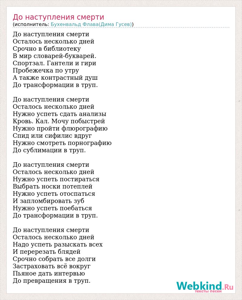До наступления смерти Осталось несколько дней Срочно в библиотеку В мир словарей-букварей. Спортзал. Гантели и гири Пробежечка по утру А также контрастный душ До трансформации в труп. До наступления смерти Осталось несколько дней Нужно успеть сдать анализы Кровь. Кал. Мочу побыстрей Нужно пройти флюрографию Спид или сифилис вдруг Нужно смотреть порнографию До сублимации в труп. До наступления смерти Осталось несколько дней Нужно успеть постираться Выбрать носки потеплей Нужно успеть отоспаться И запломбировать зуб Нужно успеть поебаться До трансформации в труп. До наступления смерти Осталось несколько дней Надо успеть разыскать всех И перерезать блядей Срочно собрать все долги Застраховать всё вокруг Пьяное дать интервью До превращения в труп.