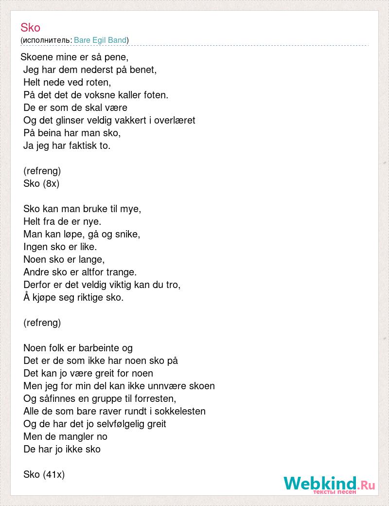 Skoene mine er så pene, Jeg har dem nederst på benet, Helt nede ved roten, På det det de voksne kaller foten. De er som de skal være Og det glinser veldig vakkert i overlæret På beina har man sko, Ja jeg har faktisk to. (refreng) Sko (8x) Sko kan man bruke til mye, Helt fra de er nye. Man kan løpe, gå og snike, Ingen sko er like. Noen sko er lange, Andre sko er altfor trange. Derfor er det veldig viktig kan du tro, Å kjøpe seg riktige sko. (refreng) Noen folk er barbeinte og Det er de som ikke har noen sko på Det kan jo være greit for noen Men jeg for min del kan ikke unnvære skoen Og såfinnes en gruppe til forresten, Alle de som bare raver rundt i sokkelesten Og de har det jo selvfølgelig greit Men de mangler no De har jo ikke sko Sko (41x)