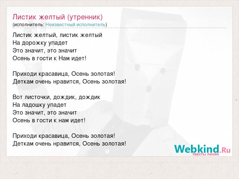 Листик желтый, листик желтый На дорожку упадет Это значит, это значит Осень в гости к Нам идет! Приходи красавица, Осень золотая! Деткам очень нравится, Осень золотая! Вот листочки, дождик, дождик На ладошку упадет Это значит, это значит Осень в гости к нам идет! Приходи красавица, Осень золотая! Деткам очень нравится, Осень золотая!