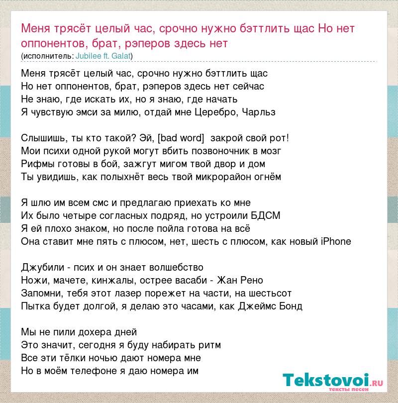 Главная→Исполнители→Jubilee ft. Galat→Меня трясёт целый час, срочно нужно бэттлить щас Но нет оппонентов, брат, рэперо