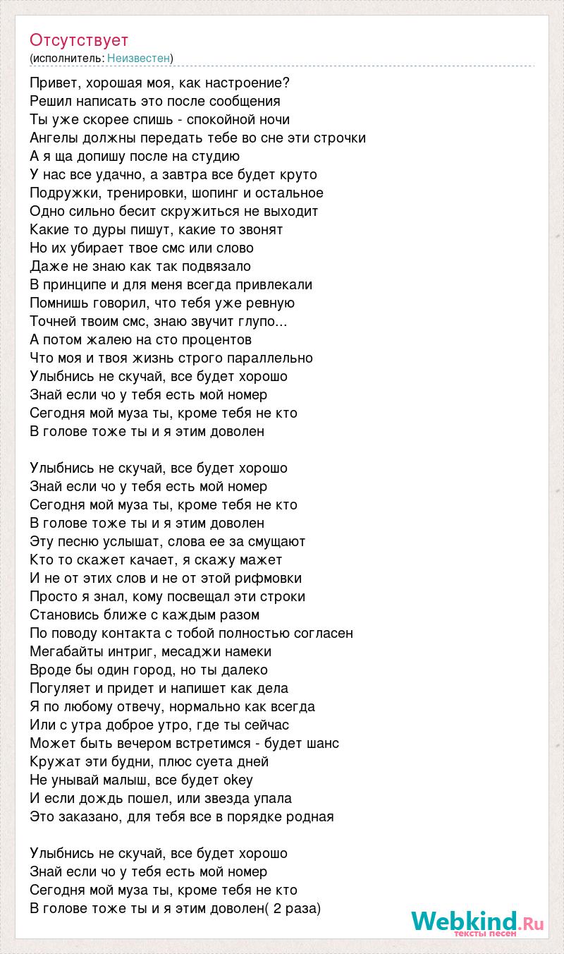 Привет, хорошая моя, как настроение? Решил написать это после сообщения Ты уже скорее спишь - спокойной ночи Ангелы должны передать тебе во сне эти строчки А я ща допишу после на студию У нас все удачно, а завтра все будет круто Подружки, тренировки, шопинг и остальное Одно сильно бесит скружиться не выходит Какие то дуры пишут, какие то звонят Но их убирает твое смс или слово Даже не знаю как так подвязало В принципе и для меня всегда привлекали Помнишь говорил, что тебя уже ревную Точней твоим смс, знаю звучит глупо... А потом жалею на сто процентов Что моя и твоя жизнь строго параллельно Улыбнись не скучай, все будет хорошо Знай если чо у тебя есть мой номер Сегодня мой муза ты, кроме тебя не кто В голове тоже ты и я этим доволен Улыбнись не скучай, все будет хорошо Знай если чо у тебя есть мой номер Сегодня мой муза ты, кроме тебя не кто В голове тоже ты и я этим доволен Эту песню услышат, слова ее за смущают Кто то скажет качает, я скажу мажет И не от этих слов и не от этой рифмовки Просто я знал, кому посвещал эти строки Становись ближе с каждым разом По поводу контакта с тобой полностью согласен Мегабайты интриг, месаджи намеки Вроде бы один город, но ты далеко Погуляет и придет и напишет как дела Я по любому отвечу, нормально как всегда Или с утра доброе утро, где ты сейчас Может быть вечером встретимся - будет шанс Кружат эти будни, плюс суета дней Не унывай малыш, все будет okey И если дождь пошел, или звезда упала Это заказано, для тебя все в порядке родная Улыбнись не скучай, все будет хорошо Знай если чо у тебя есть мой номер Сегодня мой муза ты, кроме тебя не кто В голове тоже ты и я этим доволен( 2 раза)