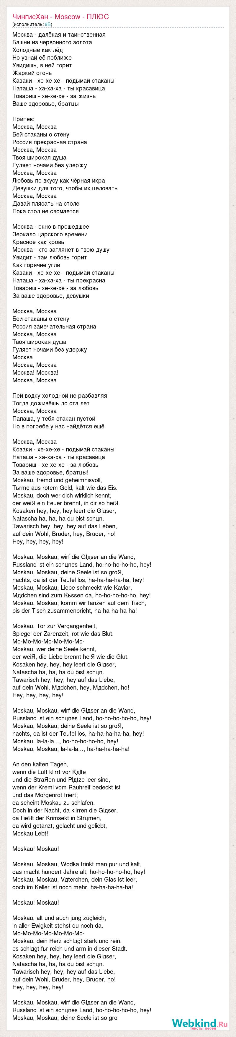 Москва - далёкая и таинственная Башни из червонного золота Холодные как лёд Но узнай её поближе Увидишь, в ней горит Жаркий огонь Казаки - хе-хе-хе - подымай стаканы Наташа - ха-ха-ха - ты красавица Товарищ - хе-хе-хе - за жизнь Ваше здоровье, братцы Припев: Москва, Москва Бей стаканы о стену Россия прекрасная страна Москва, Москва Твоя широкая душа Гуляет ночами без удержу Москва, Москва Любовь по вкусу как чёрная икра Девушки для того, чтобы их целовать Москва, Москва Давай плясать на столе Пока стол не сломается Москва - окно в прошедшее Зеркало царского времени Красное как кровь Москва - кто заглянет в твою душу Увидит - там любовь горит Как горячие угли Казаки - хе-хе-хе - подымай стаканы Наташа - ха-ха-ха - ты прекрасна Товарищ - хе-хе-хе - за любовь За ваше здоровье, девушки Москва, Москва Бей стаканы о стену Россия замечательная страна Москва, Москва Твоя широкая душа Гуляет ночами без удержу Москва Москва, Москва Москва! Москва! Москва, Москва Пей водку холодной не разбавляя Тогда доживёшь до ста лет Москва, Москва Папаша, у тебя стакан пустой Но в погребе у нас найдётся ещё Москва, Москва Козаки - хе-хе-хе - подымай стаканы Наташа - ха-ха-ха - ты красавица Товарищ - хе-хе-хе - за любовь За ваше здоровье, братцы! Moskau, fremd und geheimnisvoll, Tьrme aus rotem Gold, kalt wie das Eis. Moskau, doch wer dich wirklich kennt, der weiЯ ein Feuer brennt, in dir so heiЯ. Kosaken hey, hey, hey leert die Glдser, Natascha ha, ha, ha du bist schцn. Tawarisch hey, hey, hey auf das Leben, auf dein Wohl, Bruder, hey, Bruder, ho! Hey, hey, hey, hey! Moskau, Moskau, wirf die Glдser an die Wand, Russland ist ein schцnes Land, ho-ho-ho-ho-ho, hey! Moskau, Moskau, deine Seele ist so groЯ, nachts, da ist der Teufel los, ha-ha-ha-ha-ha, hey! Moskau, Moskau, Liebe schmeckt wie Kaviar, Mдdchen sind zum Kьssen da, ho-ho-ho-ho-ho, hey! Moskau, Moskau, komm wir tanzen auf dem Tisch, bis der Tisch zusammenbricht, ha-ha-ha-ha-ha! Moskau, Tor zur Vergangenheit, Spiegel der Zarenzeit, rot wie das Blut. Mo-Mo-Mo-Mo-Mo-Mo-Mo- Moskau, wer deine Seele kennt, der weiЯ, die Liebe brennt heiЯ wie die Glut. Kosaken hey, hey, hey leert die Glдser, Natascha ha, ha, ha du bist schцn. Tawarisch hey, hey, hey auf das Liebe, auf dein Wohl, Mдdchen, hey, Mдdchen, ho! Hey, hey, hey, hey! Moskau, Moskau, wirf die Glдser an die Wand, Russland ist ein schцnes Land, ho-ho-ho-ho-ho, hey! Moskau, Moskau, deine Seele ist so groЯ, nachts, da ist der Teufel los, ha-ha-ha-ha-ha, hey! Moskau, la-la-la..., ho-ho-ho-ho-ho, hey! Moskau, Moskau, la-la-la..., ha-ha-ha-ha-ha! An den kalten Tagen, wenn die Luft klirrt vor Kдlte und die StraЯen und Plдtze leer sind, wenn der Kreml vom Rauhreif bedeckt ist und das Morgenrot friert; da scheint Moskau zu schlafen. Doch in der Nacht, da klirren die Glдser, da flieЯt der Krimsekt in Strцmen, da wird getanzt, gelacht und geliebt, Moskau Lebt! Moskau! Moskau! Moskau, Moskau, Wodka trinkt man pur und kalt, das macht hundert Jahre alt, ho-ho-ho-ho-ho, hey! Moskau, Moskau, Vдterchen, dein Glas ist leer, doch im Keller ist noch mehr, ha-ha-ha-ha-ha! Moskau! Moskau! Moskau, alt und auch jung zugleich, in aller Ewigkeit stehst du noch da. Mo-Mo-Mo-Mo-Mo-Mo-Mo- Moskau, dein Herz schlдgt stark und rein, es schlдgt fьr reich und arm in dieser Stadt. Kosaken hey, hey, hey leert die Glдser, Natascha ha, ha, ha du bist schцn. Tawarisch hey, hey, hey auf das Liebe, auf dein Wohl, Bruder, hey, Bruder, ho! Hey, hey, hey, hey! Moskau, Moskau, wirf die Glдser an die Wand, Russland ist ein schцnes Land, ho-ho-ho-ho-ho, hey! Moskau, Moskau, deine Seele ist so gro