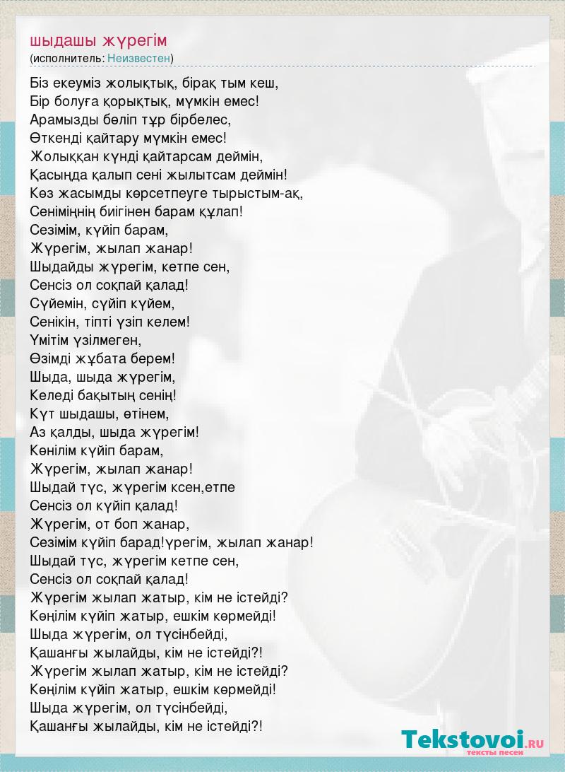 Біз екеуміз жолықтық, бірақ тым кеш, Бір болуға қорықтық, мүмкін емес! Арамызды бөліп тұр бірбелес, Өткенді қайтару мүмкін емес! Жолыққан күнді қайтарсам деймін, Қасыңда қалып сені жылытсам деймін! Көз жасымды көрсетпеуге тырыстым-ақ, Сеніміңнің биігінен барам құлап! Сезімім, күйіп барам, Жүрегім, жылап жанар! Шыдайды жүрегім, кетпе сен, Сенсіз ол соқпай қалад! Сүйемін, сүйіп күйем, Сенікін, тіпті үзіп келем! Үмітім үзілмеген, Өзімді жұбата берем! Шыда, шыда жүрегім, Келеді бақытың сенің! Күт шыдашы, өтінем, Аз қалды, шыда жүрегім! Көнілім күйіп барам, Жүрегім, жылап жанар! Шыдай түс, жүрегім ксен,етпе Сенсіз ол күйіп қалад! Жүрегім, от боп жанар, Сезімім күйіп барад!үрегім, жылап жанар! Шыдай түс, жүрегім кетпе сен, Сенсіз ол соқпай қалад! Жүрегім жылап жатыр, кім не істейді? Көңілім күйіп жатыр, ешкім көрмейді! Шыда жүрегім, ол түсінбейді, Қашанғы жылайды, кім не істейді?! Жүрегім жылап жатыр, кім не істейді? Көңілім күйіп жатыр, ешкім көрмейді! Шыда жүрегім, ол түсінбейді, Қашанғы жылайды, кім не істейді?!