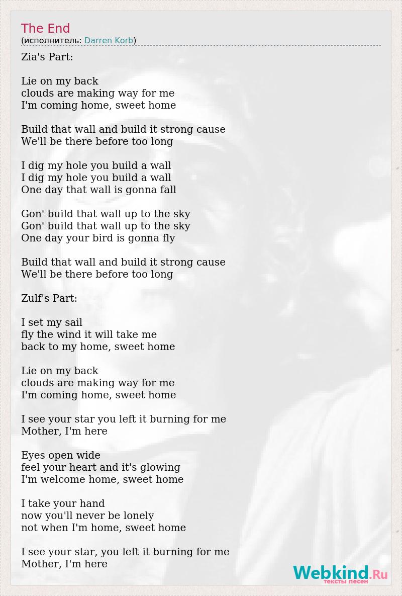 Zia's Part: Lie on my back clouds are making way for me I'm coming home, sweet home Build that wall and build it strong cause We'll be there before too long I dig my hole you build a wall I dig my hole you build a wall One day that wall is gonna fall Gon' build that wall up to the sky Gon' build that wall up to the sky One day your bird is gonna fly Build that wall and build it strong cause We'll be there before too long Zulf's Part: I set my sail fly the wind it will take me back to my home, sweet home Lie on my back clouds are making way for me I'm coming home, sweet home I see your star you left it burning for me Mother, I'm here Eyes open wide feel your heart and it's glowing I'm welcome home, sweet home I take your hand now you'll never be lonely not when I'm home, sweet home I see your star, you left it burning for me Mother, I'm here