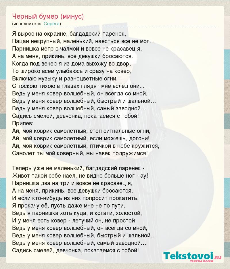 Я вырос на окраине, багдадский паренек, Пацан некрупный, маленький, наесться все не мог… Парнишка метр с чалмой и вовсе не красавец я, А на меня, прикинь, все девушки бросаются. Когда под вечер я из дома выхожу во двор, То широко всем улыбаюсь и сразу на ковер, Включаю музыку и разноцветные огни, С тоскою тихою в глазах глядят мне вслед они... Ведь у меня ковер волшебный, он всегда со мной, Ведь у меня ковер волшебный, быстрый и шальной… Ведь у меня ковер волшебный, самый заводной… Садись смелей, девчонка, покатаемся с тобой! Припев: Ай, мой коврик самолетный, стоп сигнальные огни, Ай, мой коврик самолетный, если можешь, догони! Ай, мой коврик самолетный, птичкой в небе кружится, Самолет ты мой коверный, мы навек подружимся! Теперь уже не маленький, багдадский паренек - Живот такой себе наел, не видно больше ног - ау! Парнишка два на три и вовсе не красавец я, А на меня, прикинь, все девушки бросаются. И если кто-нибудь из них попросит прокатить, Я прокачу её, пусть даже мне не по пути. Ведь я парнишка хоть куда, и кстати, холостой, И у меня есть ковер - летучий он, не простой Ведь у меня ковер волшебный, он всегда со мной, Ведь у меня ковер волшебный, быстрый и шальной… Ведь у меня ковер волшебный, самый заводной… Садись смелей, девчонка, покатаемся с тобой!