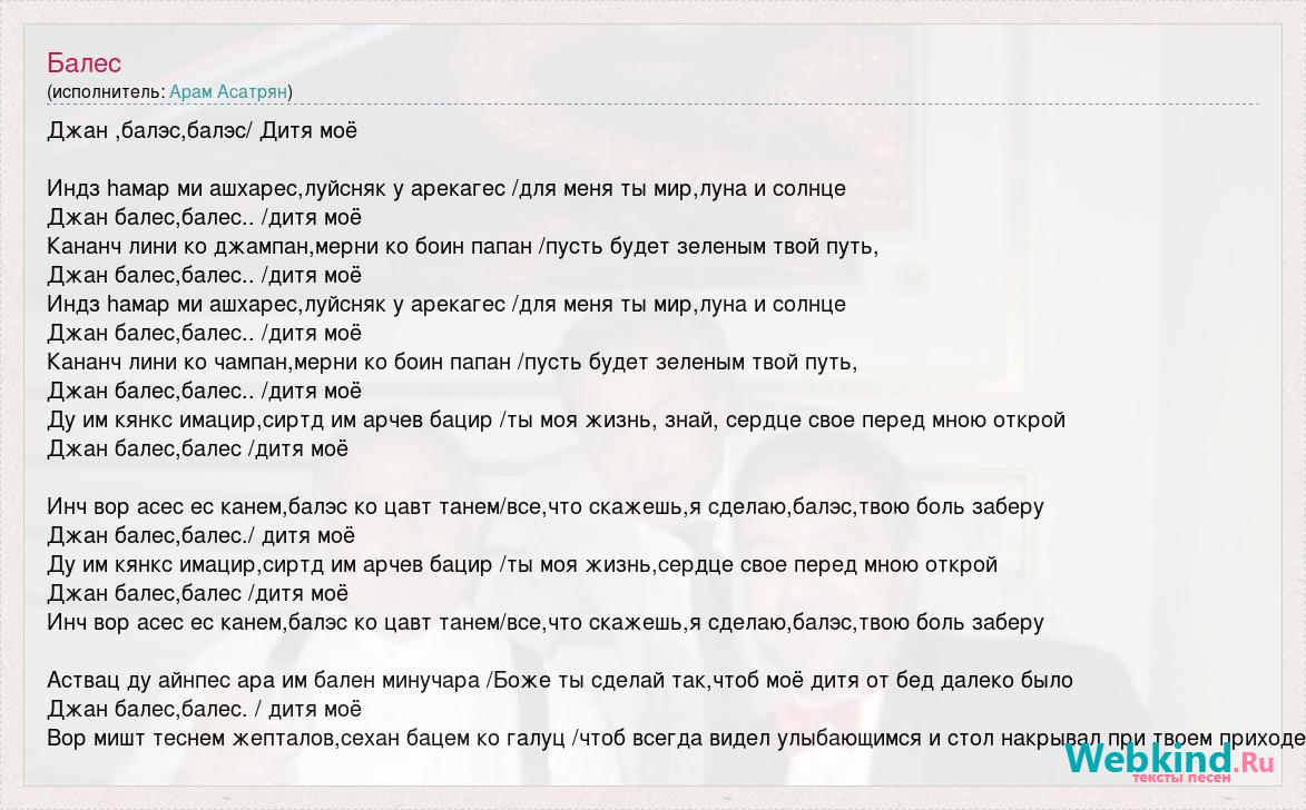 Джан ,балэс,балэс/ Дитя моё Индз hамар ми ашхарес,луйсняк у арекагес /для меня ты мир,луна и солнце Джан балес,балес.. /дитя моё Кананч лини ко джампан,мерни ко боин папан /пусть будет зеленым твой путь, Джан балес,балес.. /дитя моё Индз hамар ми ашхарес,луйсняк у арекагес /для меня ты мир,луна и солнце Джан балес,балес.. /дитя моё Кананч лини ко чампан,мерни ко боин папан /пусть будет зеленым твой путь, Джан балес,балес.. /дитя моё Ду им кянкс имацир,сиртд им арчев бацир /ты моя жизнь, знай, сердце свое перед мною открой Джан балес,балес /дитя моё Инч вор асес ес канем,балэс ко цавт танем/все,что скажешь,я сделаю,балэс,твою боль заберу Джан балес,балес./ дитя моё Ду им кянкс имацир,сиртд им арчев бацир /ты моя жизнь,сердце свое перед мною открой Джан балес,балес /дитя моё Инч вор асес ес канем,балэс ко цавт танем/все,что скажешь,я сделаю,балэс,твою боль заберу Аствац ду айнпес ара им бален минучара /Боже ты сделай так,чтоб моё дитя от бед далеко было Джан балес,балес. / дитя моё Вор мишт теснем жепталов,сехан бацем ко галуц /чтоб всегда видел улыбающимся и стол накрывал при твоем приходе