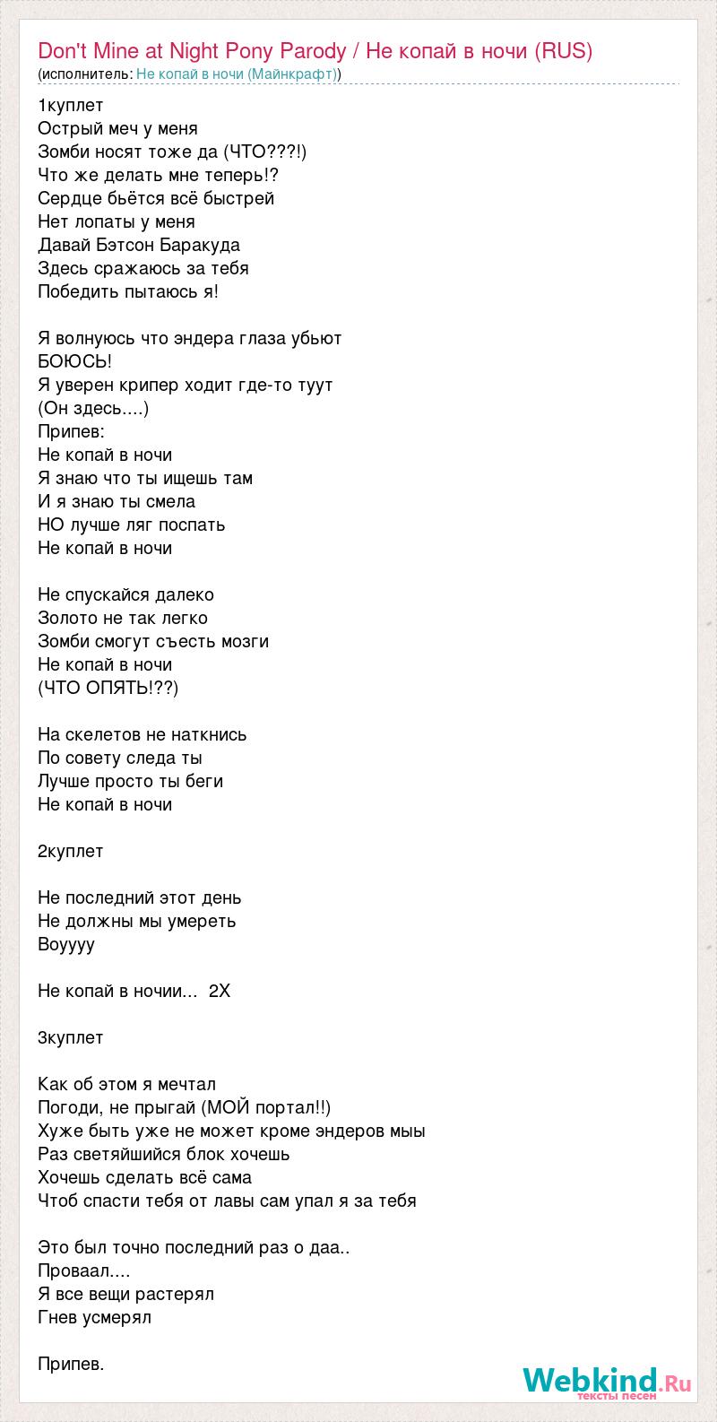 1куплет Острый меч у меня Зомби носят тоже да (ЧТО???!) Что же делать мне теперь!? Сердце бьётся всё быстрей Нет лопаты у меня Давай Бэтсон Баракуда Здесь сражаюсь за тебя Победить пытаюсь я! Я волнуюсь что эндера глаза убьют БОЮСЬ! Я уверен крипер ходит где-то туут (Он здесь....) Припев: Не копай в ночи Я знаю что ты ищешь там И я знаю ты смела НО лучше ляг поспать Не копай в ночи Не спускайся далеко Золото не так легко Зомби смогут съесть мозги Не копай в ночи (ЧТО ОПЯТЬ!??) На скелетов не наткнись По совету следа ты Лучше просто ты беги Не копай в ночи 2куплет Не последний этот день Не должны мы умереть Воуууу Не копай в ночии... 2X 3куплет Как об этом я мечтал Погоди, не прыгай (МОЙ портал!!) Хуже быть уже не может кроме эндеров мыы Раз светяйшийся блок хочешь Хочешь сделать всё сама Чтоб спасти тебя от лавы сам упал я за тебя Это был точно последний раз о даа.. Проваал.... Я все вещи растерял Гнев усмерял Припев.