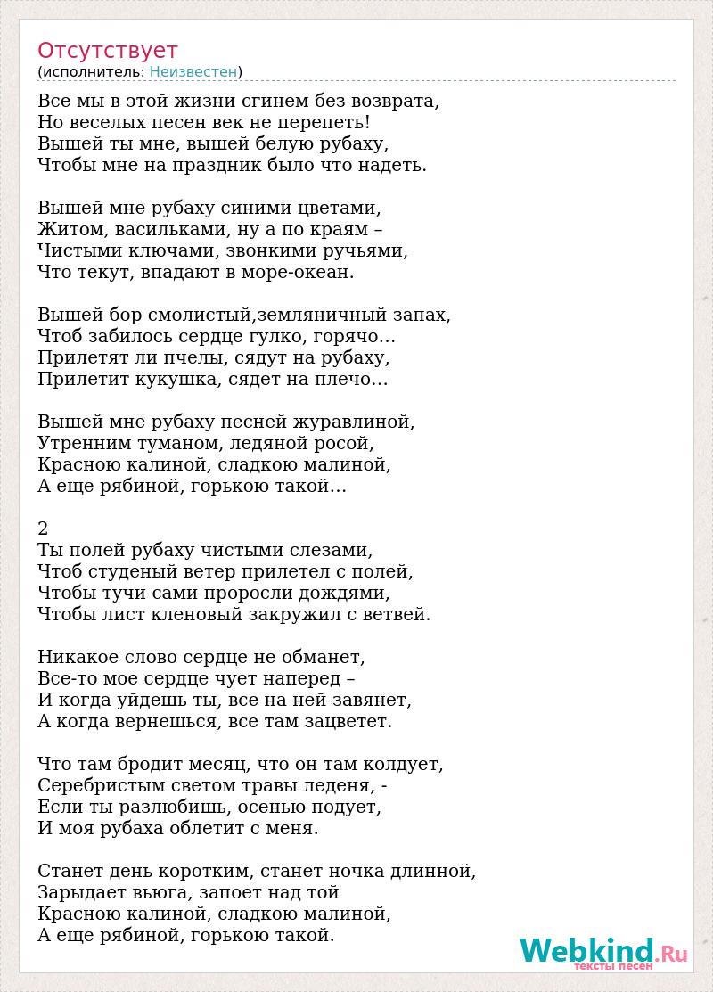 Все мы в этой жизни сгинем без возврата, Но веселых песен век не перепеть! Вышей ты мне, вышей белую рубаху, Чтобы мне на праздник было что надеть. Вышей мне рубаху синими цветами, Житом, васильками, ну а по краям – Чистыми ключами, звонкими ручьями, Что текут, впадают в море-океан. Вышей бор смолистый,земляничный запах, Чтоб забилось сердце гулко, горячо… Прилетят ли пчелы, сядут на рубаху, Прилетит кукушка, сядет на плечо… Вышей мне рубаху песней журавлиной, Утренним туманом, ледяной росой, Красною калиной, сладкою малиной, А еще рябиной, горькою такой… 2 Ты полей рубаху чистыми слезами, Чтоб студеный ветер прилетел с полей, Чтобы тучи сами проросли дождями, Чтобы лист кленовый закружил с ветвей. Никакое слово сердце не обманет, Все-то мое сердце чует наперед – И когда уйдешь ты, все на ней завянет, А когда вернешься, все там зацветет. Что там бродит месяц, что он там колдует, Серебристым светом травы леденя, - Если ты разлюбишь, осенью подует, И моя рубаха облетит с меня. Станет день коротким, станет ночка длинной, Зарыдает вьюга, запоет над той Красною калиной, сладкою малиной, А еще рябиной, горькою такой.
