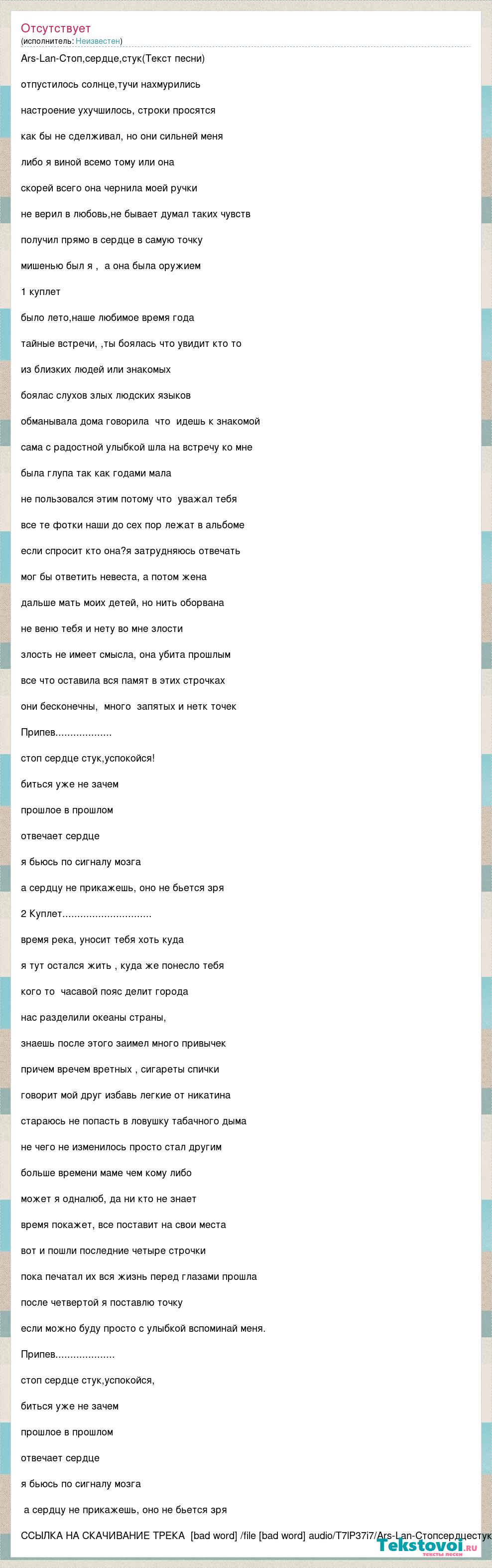 Ars-Lan-Стоп,сердце,cтук(Текст песни) отпустилось солнце,тучи нахмурились настроение ухучшилось, cтроки просятся как бы не сделживал, но они сильней меня либо я виной всемо тому или она скорей всего она чернила моей ручки не верил в любовь,не бывает думал таких чувств получил прямо в сердце в самую точку мишенью был я , а она была оружием 1 куплет было лето,наше любимое время года тайные встречи, ,ты боялась что увидит кто то из близких людей или знакомых боялас слухов злых людских языков обманывала дома говорила что идешь к знакомой сама с радостной улыбкой шла на встречу ко мне была глупа так как годами мала не пользовался этим потому что уважал тебя все те фотки наши до сех пор лежат в альбоме если спросит кто она?я затрудняюсь отвечать мог бы ответить невеста, а потом жена дальше мать моих детей, но нить оборвана не веню тебя и нету во мне злости злость не имеет смысла, она убита прошлым все что оставила вся памят в этих строчках они бесконечны, много запятых и нетк точек Припев................... cтоп сердце стук,успокойся! биться уже не зачем прошлое в прошлом отвечает сердце я бьюсь по сигналу мозга а сердцу не прикажешь, оно не бьется зря 2 Куплет.............................. время река, уносит тебя хоть куда я тут остался жить , куда же понесло тебя кого то часавой пояс делит города нас разделили океаны страны, знаешь после этого заимел много привычек причем вречем вретных , сигареты спички говорит мой друг избавь легкие от никатина стараюсь не попасть в ловушку табачного дыма не чего не изменилось просто стал другим больше времени маме чем кому либо может я одналюб, да ни кто не знает время покажет, все поставит на свои места вот и пошли последние четыре строчки пока печатал их вся жизнь перед глазами прошла после четвертой я поставлю точку если можно буду просто с улыбкой вспоминай меня. Припев.................... cтоп сердце стук,успокойся, биться уже не зачем прошлое в прошлом отвечает сердце я бьюсь по сигналу мозга а сердцу не прикажешь, оно не бьется зря ССЫЛКА НА СКАЧИВАНИЕ ТРЕКА [bad word] /file [bad word] audio/T7lP37i7/Ars-Lan-Cтопсердцестук