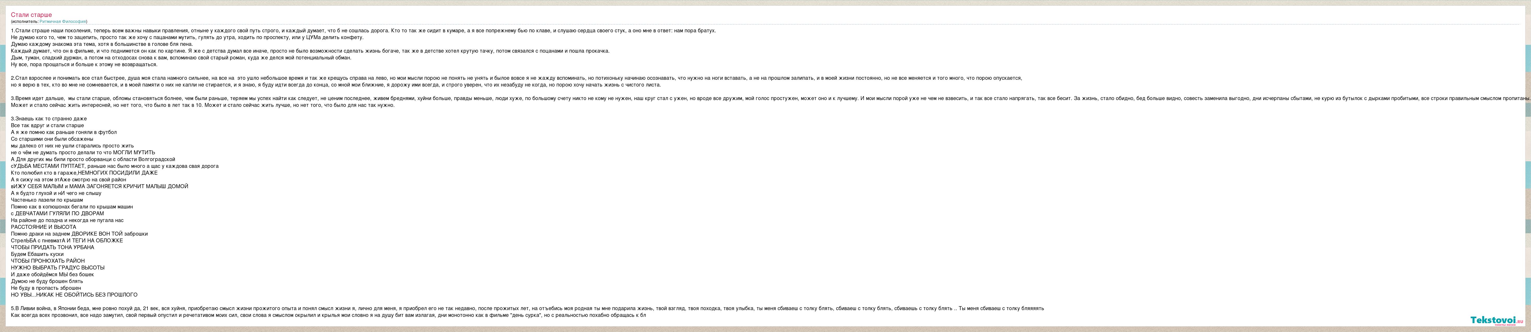 1.Стали страше наши поколения, теперь всем важны навыки правления, отныне у каждого свой путь строго, и каждый думает, что б не сошлась дорога. Кто то так же сидит в кумаре, а я все попрежнему бью по клаве, и слушаю сердца своего стук, а оно мне в ответ: нам пора братух. Не думаю кого то, чем то зацепить, просто так же хочу с пацанами мутить, гулять до утра, ходить по проспекту, или у ЦУМа делить конфету. Думаю каждому знакома эта тема, хотя в большинстве в голове бля пена. Каждый думает, что он в фильме, и что поднимется он как по картине. Я же с детства думал все иначе, просто не было возможности сделать жизнь богаче, так же в детстве хотел крутую тачку, потом связался с поцанами и пошла прокачка. Дым, туман, сладкий дурман, а потом на отходосах снова к вам, вспоминаю свой старый роман, куда же делся мой потенциальный обман. Ну все, пора прощаться и больше к этому не возвращаться. 2.Стал взрослее и понимать все стал быстрее, душа моя стала намного сильнее, на все на это ушло небольшое время и так же крещусь справа на лево, но мои мысли порою не понять не унять и былое вовсе я не жажду вспоминать, но потихоньку начинаю осознавать, что нужно на ноги вставать, а не на прошлом залипать, и в моей жизни постоянно, но не все меняется и того много, что порою опускается, но я верю в тех, кто во мне не сомневается, и в моей памяти о них не капли не стирается, и я знаю, я буду идти всегда до конца, со мной мои ближние, я дорожу ими всегда, и строго уверен, что их незабуду не когда, но порою хочу начать жизнь с чистого листа. 3.Время идет дальше, мы стали старше, обломы становяться болнее, чем были раньше, теряем мы успех найти как следует, не ценим последнее, живем бреднями, хуйни больше, правды меньше, люди хуже, по большому счету никто не кому не нужен, наш круг стал с ужен, но вроде все дружим, мой голос простужен, может оно и к лучшему. И мои мысли порой уже не чем не взвесить, и так все стало напрягать, так все бесит. За жизнь, стало обидно, бед больше видно, совесть заменила выгодно, дни исчерпаны сбытами, не курю из бутылок с дырками пробитыми, все строки правильным смыслом пропитаны. Может и стало сейчас жить интересней, но нет того, что было в лет так в 10. Может и стало сейчас жить лучше, но нет того, что было для нас так нужно. 3.Знаешь как то странно даже Все так вдруг и стали старше А я же помню как раньше гоняли в футбол Со старшими они были обсажены мы далеко от них не ушли старались просто жить не о чём не думать просто делали то что МОГЛИ МУТИТЬ А Для других мы били просто оборванци с области Волгоградской сУДЬБА МЕСТАМИ ПУПТАЕТ, раньше нас было много а щас у каждова свая дорога Кто полюбил кто в гараже,НЕМНОГИХ ПОСИДИЛИ ДАЖЕ А я сижу на этом этАже смотрю на свой район вИЖУ СЕБЯ МАЛЫМ и МАМА ЗАГОНЯЕТСЯ КРИЧИТ МАЛЫШ ДОМОЙ А я будто глухой и нИ чего не слышу Частенько лазели по крышам Помню как в копюшонах бегали по крышам машин с ДЕВЧАТАМИ ГУЛЯЛИ ПО ДВОРАМ На районе до поздна и некогда не пугала нас РАССТОЯНИЕ И ВЫСОТА Помню драки на заднем ДВОРИКЕ ВОН ТОЙ заброшки СтрелЬБА с пневматА И ТЕГИ НА ОБЛОЖКЕ ЧТОБЫ ПРИДАТЬ ТОНА УРБАНА Будем Ебашить куски ЧТОБЫ ПРОНЮХАТЬ РАЙОН НУЖНО ВЫБРАТЬ ГРАДУС ВЫСОТЫ И даже обойдёмся МЫ без бошек Думою не буду брошен блять Не буду в пропасть зброшен НО УВЫ...НИКАК НЕ ОБОЙТИСЬ БЕЗ ПРОШЛОГО 5.В Ливии война, в Японии беда, мне ровно похуй да, 21 век, вся хуйня, п