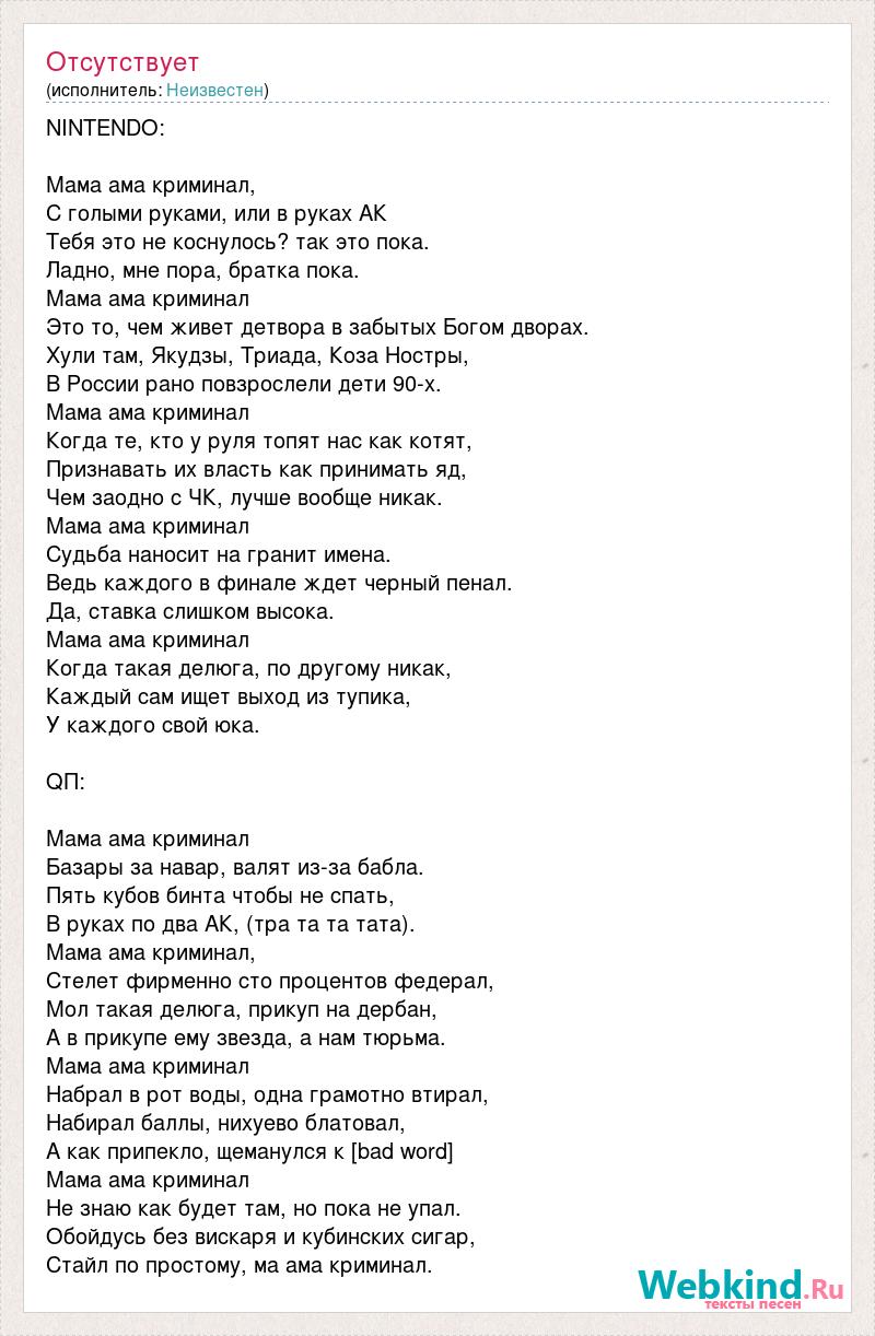 NINTENDO: Мама ама криминал, С голыми руками, или в руках АК Тебя это не коснулось? так это пока. Ладно, мне пора, братка пока. Мама ама криминал Это то, чем живет детвора в забытых Богом дворах. Хули там, Якудзы, Триада, Коза Ностры, В России рано повзрослели дети 90-х. Мама ама криминал Когда те, кто у руля топят нас как котят, Признавать их власть как принимать яд, Чем заодно с ЧК, лучше вообще никак. Мама ама криминал Судьба наносит на гранит имена. Ведь каждого в финале ждет черный пенал. Да, ставка слишком высока. Мама ама криминал Когда такая делюга, по другому никак, Каждый сам ищет выход из тупика, У каждого свой юка. QП: Мама ама криминал Базары за навар, валят из-за бабла. Пять кубов бинта чтобы не спать, В руках по два АК, (тра та та тата). Мама ама криминал, Стелет фирменно сто процентов федерал, Мол такая делюга, прикуп на дербан, А в прикупе ему звезда, а нам тюрьма. Мама ама криминал Набрал в рот воды, одна грамотно втирал, Набирал баллы, нихуево блатовал, А как припекло, щеманулся к [bad word] Мама ама криминал Не знаю как будет там, но пока не упал. Обойдусь без вискаря и кубинских сигар, Стайл по простому, ма ама криминал.