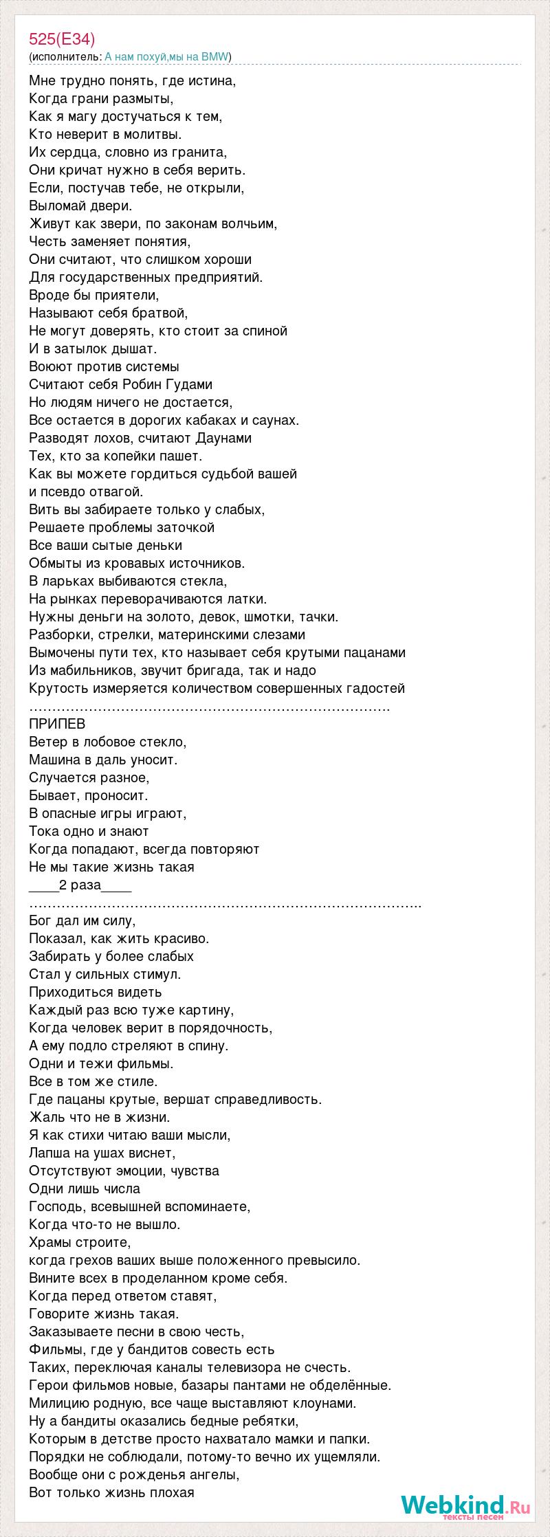 Мне трудно понять, где истина, Когда грани размыты, Как я магу достучаться к тем, Кто неверит в молитвы. Их сердца, словно из гранита, Они кричат нужно в себя верить. Если, постучав тебе, не открыли, Выломай двери. Живут как звери, по законам волчьим, Честь заменяет понятия, Они считают, что слишком хороши Для государственных предприятий. Вроде бы приятели, Называют себя братвой, Не могут доверять, кто стоит за спиной И в затылок дышат. Воюют против системы Считают себя Робин Гудами Но людям ничего не достается, Все остается в дорогих кабаках и саунах. Разводят лохов, считают Даунами Тех, кто за копейки пашет. Как вы можете гордиться судьбой вашей и псевдо отвагой. Вить вы забираете только у слабых, Решаете проблемы заточкой Все ваши сытые деньки Обмыты из кровавых источников. В ларьках выбиваются стекла, На рынках переворачиваются латки. Нужны деньги на золото, девок, шмотки, тачки. Разборки, стрелки, материнскими слезами Вымочены пути тех, кто называет себя крутыми пацанами Из мабильников, звучит бригада, так и надо Крутость измеряется количеством совершенных гадостей ……………………………………………………………………. ПРИПЕВ Ветер в лобовое стекло, Машина в даль уносит. Случается разное, Бывает, проносит. В опасные игры играют, Тока одно и знают Когда попадают, всегда повторяют Не мы такие жизнь такая ____2 раза____ ………………………………………………………………………….. Бог дал им силу, Показал, как жить красиво. Забирать у более слабых Стал у сильных стимул. Приходиться видеть Каждый раз всю туже картину, Когда человек верит в порядочность, А ему подло стреляют в спину. Одни и тежи фильмы. Все в том же стиле. Где пацаны крутые, вершат справедливость. Жаль что не в жизни. Я как стихи читаю ваши мысли, Лапша на ушах виснет, Отсутствуют эмоции, чувства Одни лишь числа Господь, всевышней вспоминаете, Когда что-то не вышло. Храмы строите, когда грехов ваших выше положенного превысило. Вините всех в проделанном кроме себя. Когда перед ответом ставят, Говорите жизнь такая. Заказываете песни в свою честь, Фильмы, где у бандитов совесть есть Таких, переключая каналы телевизора не счесть. Герои фильмов новые, базары пантами не обделённые. Милицию родную, все чаще выставляют клоунами. Ну а бандиты оказались бедные ребятки, Которым в детстве просто нахватало мамки и папки. Порядки не соблюдали, потому-то вечно их ущемляли. Вообще они с рожденья ангелы, Вот только жизнь плохая