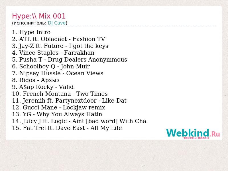 1. Hype Intro 2. ATL ft. Obladaet - Fashion TV 3. Jay-Z ft. Future - I got the keys 4. Vince Staples - Farrakhan 5. Pusha T - Drug Dealers Anonymmous 6. Schoolboy Q - John Muir 7. Nipsey Hussle - Ocean Views 8. Rigos - Архыз 9. A$ap Rocky - Valid 10. French Montana - Two Times 11. Jeremih ft. Partynextdoor - Like Dat 12. Gucci Mane - Lockjaw remix 13. YG - Why You Always Hatin 14. Juicy J ft. Logic - Aint [bad word] With Cha 15. Fat Trel ft. Dave East - All My Life