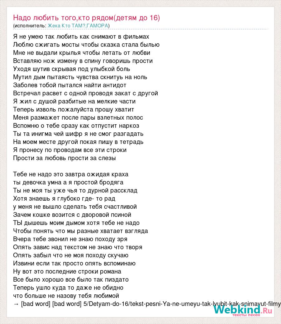 Я не умею так любить как снимают в фильмах Люблю сжигать мосты чтобы сказка стала былью Мне не выдали крылья чтобы летать от любви Вставляю нож измену в спину говоришь прости Уходя шутив скрывая под улыбкой боль Мутил дым пытаясть чувства скнитуь на ноль Заболев тобой пытался найти антидот Встречал расвет с одной проводя закат с другой Я жил с душой разбитые на мелкие части Теперь изволь пожалуйста прошу хватит Меня размажет после пары взлетных полос Вспомню о тебе сразу как отпустит наркоз Ты та инигма чей шифр я не смог разгадать На моем месте другой покая пишу в тетрадь Я пронесу по проводам все эти строки Прости за любовь прости за слезы Тебе не надо это завтра ожидая краха ты девочка умна а я простой бродяга Ты не моя ты уже чья то дурной рассклад Хотя знаешь я глубоко где- то рад у меня не вышло сделать тебя счастливой Зачем кошке возится с дворовой псиной ТЫ дышешь моим дымом хотя тебе не надо Чтобы понять что мы разные хватает взгляда Вчера тебе звонил не знаю походу зря Опять завис над текстом не знаю что творя Опять забыл что не моя походу скучаю Извини если так просто опять вспоминаю Ну вот это последние строки романа Все было хорошо все было так пиздато Теперь ушло куда то даже не обидно что больше не назову тебя любимой → [bad word] [bad word] 5/Detyam-do-16/tekst-pesni-Ya-ne-umeyu-tak-lyubit-kak-snimayut-filmy