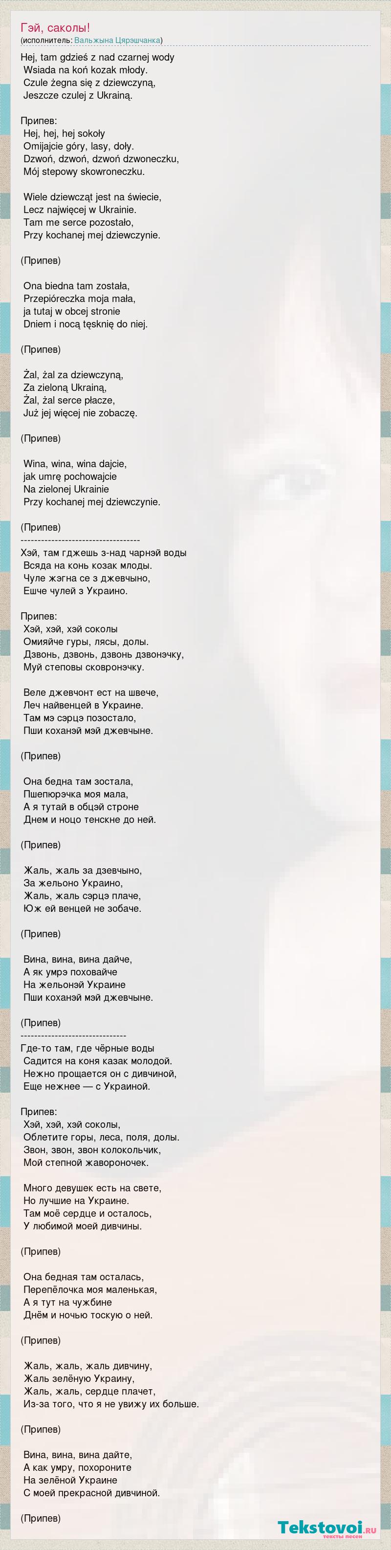 Hej, tam gdzieś z nad czarnej wody Wsiada na koń kozak młody. Czule żegna się z dziewczyną, Jeszcze czulej z Ukrainą. Припев: Hej, hej, hej sokoły Omijajcie góry, lasy, doły. Dzwoń, dzwoń, dzwoń dzwoneczku, Mój stepowy skowroneczku. Wiele dziewcząt jest na świecie, Lecz najwięcej w Ukrainie. Tam me serce pozostało, Przy kochanej mej dziewczynie. (Припев) Ona biedna tam została, Przepióreczka moja mała, ja tutaj w obcej stronie Dniem i nocą tęsknię do niej. (Припев) Żal, żal za dziewczyną, Za zieloną Ukrainą, Żal, żal serce płacze, Już jej więcej nie zobaczę. (Припев) Wina, wina, wina dajcie, jak umrę pochowajcie Na zielonej Ukrainie Przy kochanej mej dziewczynie. (Припев) ----------------------------------- Хэй, там гджешь з-над ча́рнэй во́ды Вся́да на конь ко́зак мло́ды. Чу́ле жэ́гна се з джевчы́но, Е́шче чу́лей з Украино. Припев: Хэй, хэй, хэй соко́лы Омия́йче гу́ры, ля́сы, долы. Дзвонь, дзвонь, дзвонь дзвонэ́чку, Муй степо́вы сковронэ́чку. Ве́ле дже́вчонт ест на шве́че, Леч найве́нцей в Украине. Там мэ сэ́рцэ позоста́ло, Пши коха́нэй мэй джевчы́не. (Припев) О́на бе́дна там зоста́ла, Пшепюрэ́чка моя ма́ла, А я ту́тай в о́бцэй стро́не Днем и ноцо те́нскне до ней. (Припев) Жаль, жаль за дзевчы́но, За жельо́но Украино, Жаль, жаль сэ́рцэ пла́че, Юж ей ве́нцей не зоба́че. (Припев) Ви́на, вина, вина да́йче, А як у́мрэ похова́йче На жельонэй Украине Пши коханэй мэй джевчыне. (Припев) ------------------------------- Где-то там, где чёрные воды Садится на коня казак молодой. Нежно прощается он с дивчиной, Еще нежнее — с Украиной. Припев: Хэй, хэй, хэй соколы, Облетите горы, леса, поля, долы. Звон, звон, звон колокольчик, Мой степной жавороночек. Много девушек есть на свете, Но лучшие на Украине. Там моё сердце и осталось, У любимой моей дивчины. (Припев) Она бедная там осталась, Перепёлочка моя маленькая, А я тут на чужбине Днём и ночью тоскую о ней. (Припев) Жаль, жаль, жаль дивчину, Жаль зелёную Украину, Жаль, жаль, сердце плачет, Из-за того, что я не увижу их больше. (Припев) Вина, вина, вина дайте, А как умру, похороните На зелёной Украине С моей прекрасной дивчиной. (Припев)