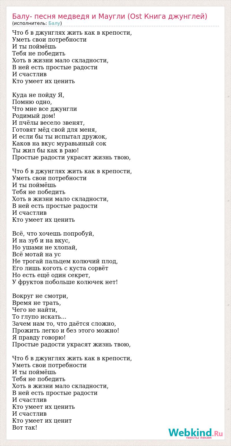Что б в джунглях жить как в крепости, Уметь свои потребности И ты поймёшь Тебя не победить Хоть в жизни мало складности, В ней есть простые радости И счастлив Кто умеет их ценить Куда не пойду Я, Помню одно, Что мне все джунгли Родимый дом! И пчёлы весело звенят, Готовят мёд свой для меня, И если бы ты испытал дружок, Каков на вкус муравьиный сок Ты жил бы как в раю! Простые радости украсят жизнь твою, Что б в джунглях жить как в крепости, Уметь свои потребности И ты поймёшь Тебя не победить Хоть в жизни мало складности, В ней есть простые радости И счастлив Кто умеет их ценить Всё, что хочешь попробуй, И на зуб и на вкус, Но ушами не хлопай, Всё мотай на ус Не трогай пальцем колючий плод, Его лишь коготь с куста сорвёт Но есть ещё один секрет, У фруктов побольше колючек нет! Вокруг не смотри, Время не трать, Чего не найти, То глупо искать... Зачем нам то, что даётся сложно, Прожить легко и без этого можно! Я правду говорю! Простые радости украсят жизнь твою, Что б в джунглях жить как в крепости, Уметь свои потребности И ты поймёшь Тебя не победить Хоть в жизни мало складности, В ней есть простые радости И счастлив Кто умеет их ценить И счастлив Кто умеет их ценит Вот так!