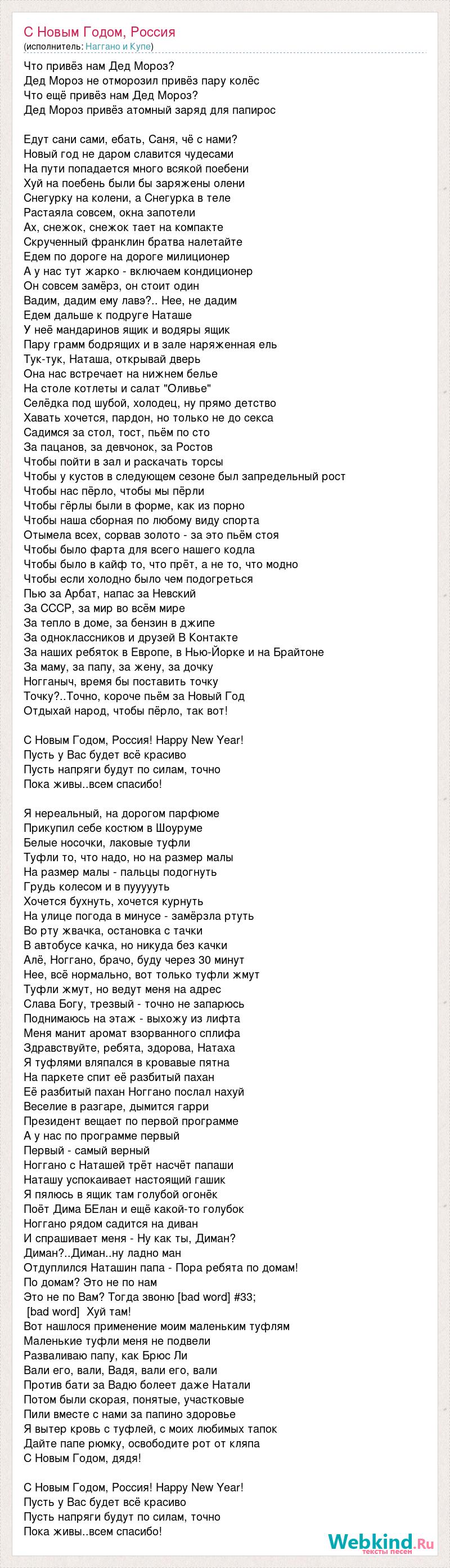 Что привёз нам Дед Мороз? Дед Мороз не отморозил привёз пару колёс Что ещё привёз нам Дед Мороз? Дед Мороз привёз атомный заряд для папирос Едут сани сами, ебать, Саня, чё с нами? Новый год не даром славится чудесами На пути попадается много всякой поебени Хуй на поебень были бы заряжены олени Снегурку на колени, а Снегурка в теле Растаяла совсем, окна запотели Ах, снежок, снежок тает на компакте Скрученный франклин братва налетайте Едем по дороге на дороге милиционер А у нас тут жарко - включаем кондиционер Он совсем замёрз, он стоит один Вадим, дадим ему лавэ?.. Нее, не дадим Едем дальше к подруге Наташе У неё мандаринов ящик и водяры ящик Пару грамм бодрящих и в зале наряженная ель Тук-тук, Наташа, открывай дверь Она нас встречает на нижнем белье На столе котлеты и салат "Оливье" Селёдка под шубой, холодец, ну прямо детство Хавать хочется, пардон, но только не до секса Садимся за стол, тост, пьём по сто За пацанов, за девчонок, за Ростов Чтобы пойти в зал и раскачать торсы Чтобы у кустов в следующем сезоне был запредельный рост Чтобы нас пёрло, чтобы мы пёрли Чтобы гёрлы были в форме, как из порно Чтобы наша сборная по любому виду спорта Отымела всех, сорвав золото - за это пьём стоя Чтобы было фарта для всего нашего кодла Чтобы было в кайф то, что прёт, а не то, что модно Чтобы если холодно было чем подогреться Пью за Арбат, напас за Невский За СССР, за мир во всём мире За тепло в доме, за бензин в джипе За одноклассников и друзей В Контакте За наших ребяток в Европе, в Нью-Йорке и на Брайтоне За маму, за папу, за жену, за дочку Ногганыч, время бы поставить точку Точку?..Точно, короче пьём за Новый Год Отдыхай народ, чтобы пёрло, так вот! С Новым Годом, Россия! Happy New Year! Пусть у Вас будет всё красиво Пусть напряги будут по силам, точно Пока живы..всем спасибо! Я нереальный, на дорогом парфюме Прикупил себе костюм в Шоуруме Белые носочки, лаковые туфли Туфли то, что надо, но на размер малы На размер малы - пальцы подогнуть Грудь колесом и в пуууууть Хочется бухнуть, хочется курнуть На улице погода в минусе - замёрзла ртуть Во рту жвачка, остановка с тачки В автобусе качка, но никуда без качки Алё, Ноггано, брачо, буду через 30 минут Нее, всё нормально, вот только туфли жмут Туфли жмут, но ведут меня на адрес Слава Богу, трезвый - точно не запарюсь Поднимаюсь на этаж - выхожу из лифта Меня манит аромат взорванного сплифа Здравствуйте, ребята, здорова, Натаха Я туфлями вляпался в кровавые пятна На паркете спит её разбитый пахан Её разбитый пахан Ноггано послал нахуй Веселие в разгаре, дымится гарри Президент вещает по первой программе А у нас по программе первый Первый - самый верный Ноггано с Наташей трёт насчёт папаши Наташу успокаивает настоящий гашик Я пялюсь в ящик там голубой огонёк Поёт Дима БЕлан и ещё какой-то голубок Ноггано рядом садится на диван И спрашивает меня - Ну как ты, Диман? Диман?..Диман..ну ладно ман Отдуплился Наташин папа - Пора ребята по домам! По домам? Это не по нам Это не по Вам? Тогда звоню [bad word] #33; [bad word] Хуй там! Вот нашлося применение моим маленьким туфлям Маленькие туфли меня не подвели Разваливаю папу, как Брюс Ли Вали его, вали, Вадя, вали его, вали Против бати за Вадю болеет даже Натали Потом были скорая, понятые, участковые Пили вместе с нами за папино здоровье Я вытер кровь с туфлей, с моих любимых тапок Дайте папе рюмку, освободите рот от кляпа С