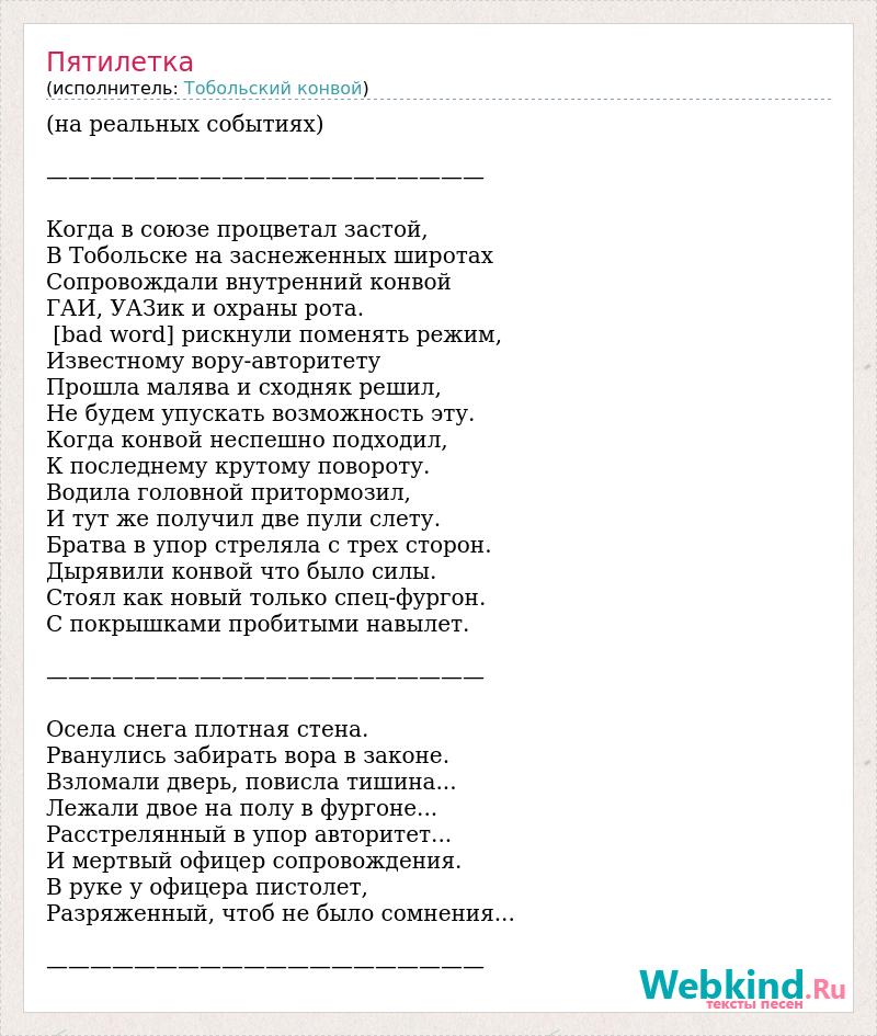 (на реальных событиях) ———————————————————— Когда в союзе процветал застой, В Тобольске на заснеженных широтах Сопровождали внутренний конвой ГАИ, УАЗик и охраны рота. [bad word] рискнули поменять режим, Известному вору-авторитету Прошла малява и сходняк решил, Не будем упускать возможность эту. Когда конвой неспешно подходил, К последнему крутому повороту. Водила головной притормозил, И тут же получил две пули слету. Братва в упор стреляла с трех сторон. Дырявили конвой что было силы. Стоял как новый только спец-фургон. С покрышками пробитыми навылет. ———————————————————— Осела снега плотная стена. Рванулись забирать вора в законе. Взломали дверь, повисла тишина... Лежали двое на полу в фургоне... Расстрелянный в упор авторитет... И мертвый офицер сопровождения. В руке у офицера пистолет, Разряженный, чтоб не было сомнения... ————————————————————