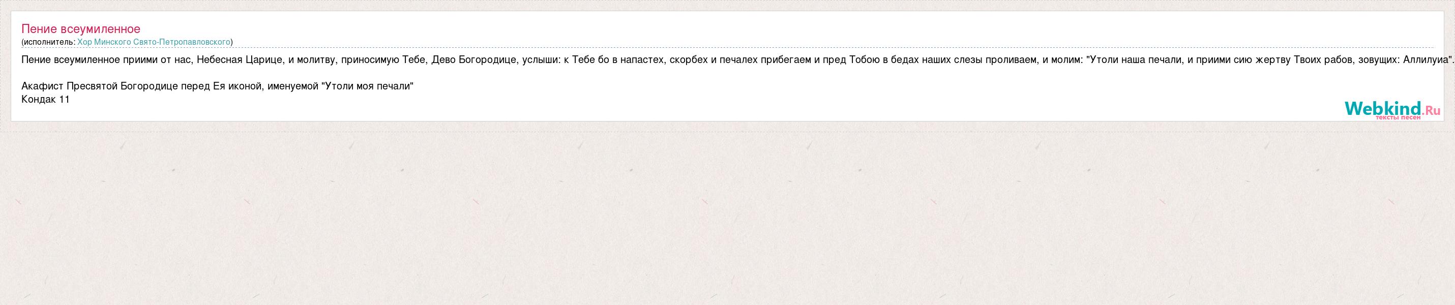 Пение всеумиленное приими от нас, Небесная Царице, и молитву, приносимую Тебе, Дево Богородице, услыши: к Тебе бо в напастех, скорбех и печалех прибегаем и пред Тобою в бедах наших слезы проливаем, и молим: "Утоли наша печали, и приими сию жертву Твоих рабов, зовущих: Аллилуиа". Акафист Пресвятой Богородице перед Ея иконой, именуемой "Утоли моя печали" Кондак 11