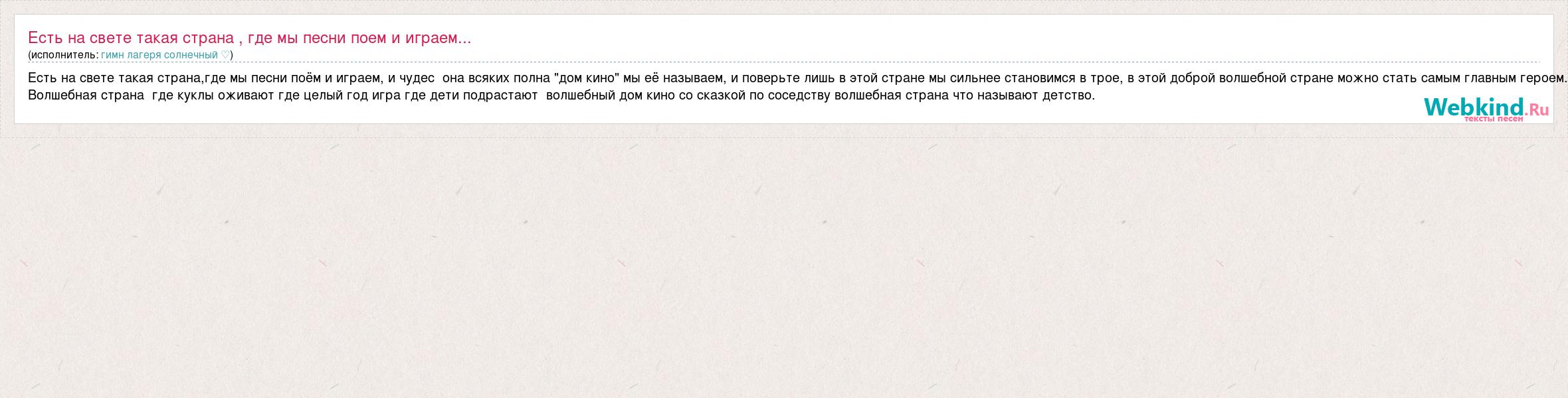 Главная→Исполнители→Гимн лагеря солнечный ♡→Есть на свете такая страна , где мы песни поем и играем...