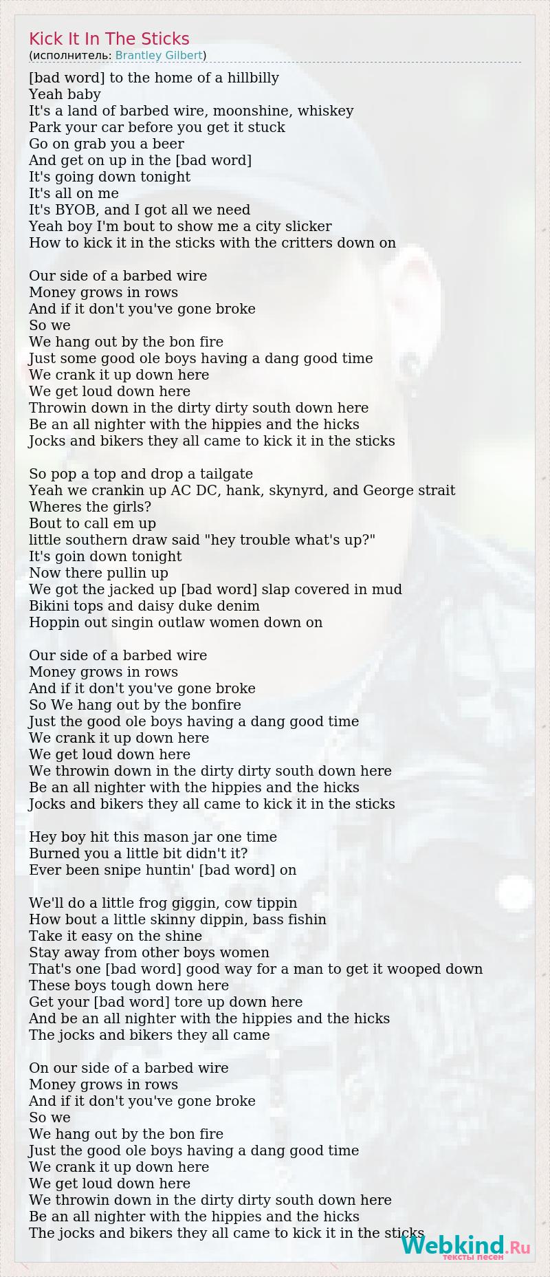 [bad word] to the home of a hillbilly Yeah baby It's a land of barbed wire, moonshine, whiskey Park your car before you get it stuck Go on grab you a beer And get on up in the [bad word] It's going down tonight It's all on me It's BYOB, and I got all we need Yeah boy I'm bout to show me a city slicker How to kick it in the sticks with the critters down on Our side of a barbed wire Money grows in rows And if it don't you've gone broke So we We hang out by the bon fire Just some good ole boys having a dang good time We crank it up down here We get loud down here Throwin down in the dirty dirty south down here Be an all nighter with the hippies and the hicks Jocks and bikers they all came to kick it in the sticks So pop a top and drop a tailgate Yeah we crankin up AC DC, hank, skynyrd, and George strait Wheres the girls? Bout to call em up little southern draw said "hey trouble what's up?" It's goin down tonight Now there pullin up We got the jacked up [bad word] slap covered in mud Bikini tops and daisy duke denim Hoppin out singin outlaw women down on Our side of a barbed wire Money grows in rows And if it don't you've gone broke So We hang out by the bonfire Just the good ole boys having a dang good time We crank it up down here We get loud down here We throwin down in the dirty dirty south down here Be an all nighter with the hippies and the hicks Jocks and bikers they all came to kick it in the sticks Hey boy hit this mason jar one time Burned you a little bit didn't it? Ever been snipe huntin' [bad word] on We'll do a little frog giggin, cow tippin How bout a little skinny dippin, bass fishin Take it easy on the shine Stay away from other boys women That's one [bad word] good way for a man to get it wooped down These boys tough down here Get your [bad word] tore up down here And be an all nighter with the hippies and the hicks The jocks and bikers they all came On our side of a barbed wire Money grows in rows And if it don't you've gone broke So we We hang out by the bon fire Just the good ole boys having a dang good time We crank it up down here We get loud down here We throwin down in the dirty dirty south down here Be an all nighter with the hippies and the hicks The jocks and bikers they all came to kick it in the sticks