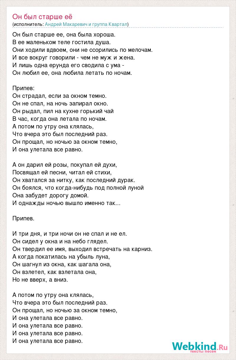 Он был старше ее, она была хороша. В ее маленьком теле гостила душа. Они ходили вдвоем, они не ссорились по мелочам. И все вокруг говорили - чем не муж и жена. И лишь одна ерунда его сводила с ума - Он любил ее, она любила летать по ночам. Припев: Он страдал, если за окном темно. Он не спал, на ночь запирал окно. Он рыдал, пил на кухне горький чай В час, когда она летала по ночам. А потом по утру она клялась, Что вчера это был последний раз. Он прощал, но ночью за окном темно, И она улетала все равно. А он дарил ей розы, покупал ей духи, Посвящал ей песни, читал ей стихи, Он хватался за нитку, как последний дурак. Он боялся, что когда-нибудь под полной луной Она забудет дорогу домой. И однажды ночью вышло именно так... Припев. И три дня, и три ночи он не спал и не ел. Он сидел у окна и на небо глядел. Он твердил ее имя, выходил встречать на карниз. А когда покатилась на убыль луна, Он шагнул из окна, как шагала она, Он взлетел, как взлетала она, Но не вверх, а вниз. А потом по утру она клялась, Что вчера это был последний раз. Он прощал, но ночью за окном темно, И она улетала все равно. И она улетала все равно. И она улетала все равно. И она улетала все равно.