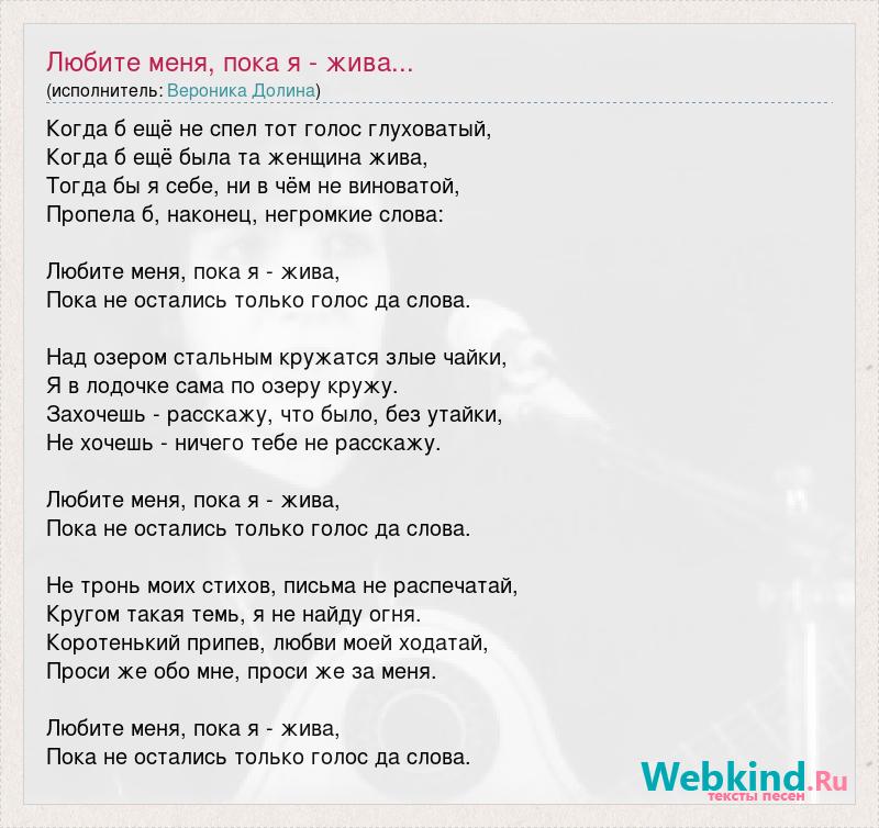 Когда б ещё не спел тот голос глуховатый, Когда б ещё была та женщина жива, Тогда бы я себе, ни в чём не виноватой, Пропела б, наконец, негромкие слова: Любите меня, пока я - жива, Пока не остались только голос да слова. Над озером стальным кружатся злые чайки, Я в лодочке сама по озеру кружу. Захочешь - расскажу, что было, без утайки, Не хочешь - ничего тебе не расскажу. Любите меня, пока я - жива, Пока не остались только голос да слова. Не тронь моих стихов, письма не распечатай, Кругом такая темь, я не найду огня. Коротенький припев, любви моей ходатай, Проси же обо мне, проси же за меня. Любите меня, пока я - жива, Пока не остались только голос да слова.