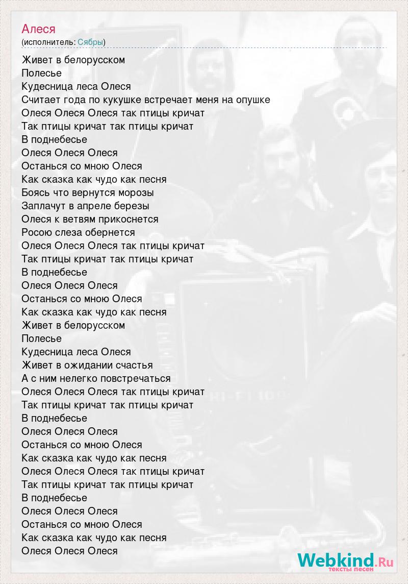 Живет в белорусском Полесье Кудесница леса Олеся Считает года по кукушке встречает меня на опушке Олеся Олеся Олеся так птицы кричат Так птицы кричат так птицы кричат В поднебесье Олеся Олеся Олеся Останься со мною Олеся Как сказка как чудо как песня Боясь что вернутся морозы Заплачут в апреле березы Олеся к ветвям прикоснется Росою слеза обернется Олеся Олеся Олеся так птицы кричат Так птицы кричат так птицы кричат В поднебесье Олеся Олеся Олеся Останься со мною Олеся Как сказка как чудо как песня Живет в белорусском Полесье Кудесница леса Олеся Живет в ожидании счастья А с ним нелегко повстречаться Олеся Олеся Олеся так птицы кричат Так птицы кричат так птицы кричат В поднебесье Олеся Олеся Олеся Останься со мною Олеся Как сказка как чудо как песня Олеся Олеся Олеся так птицы кричат Так птицы кричат так птицы кричат В поднебесье Олеся Олеся Олеся Останься со мною Олеся Как сказка как чудо как песня Олеся Олеся Олеся