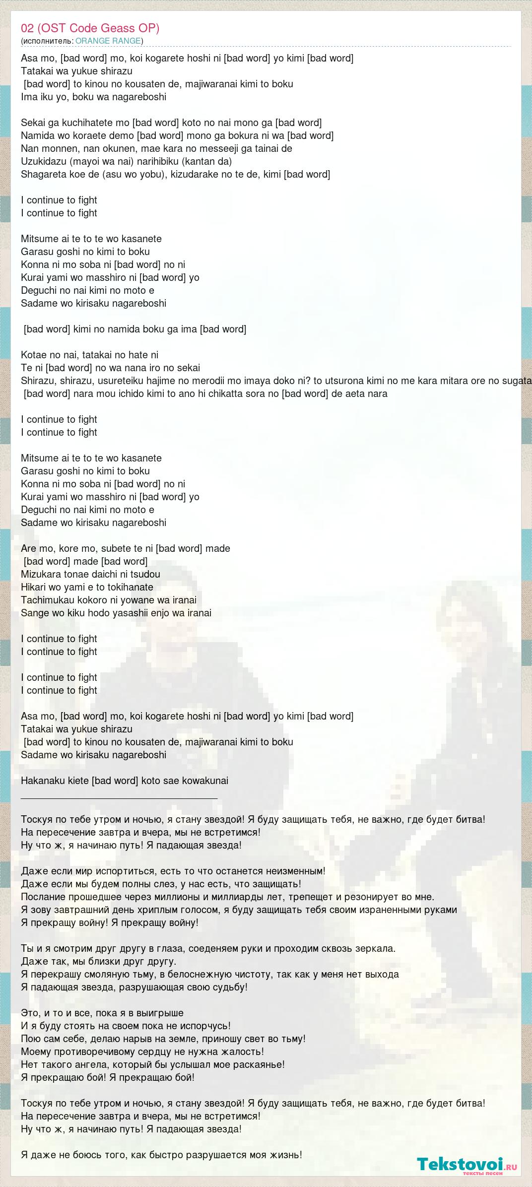 Asa mo, [bad word] mo, koi kogarete hoshi ni [bad word] yo kimi [bad word] Tatakai wa yukue shirazu [bad word] to kinou no kousaten de, majiwaranai kimi to boku Ima iku yo, boku wa nagareboshi Sekai ga kuchihatete mo [bad word] koto no nai mono ga [bad word] Namida wo koraete demo [bad word] mono ga bokura ni wa [bad word] Nan monnen, nan okunen, mae kara no messeeji ga tainai de Uzukidazu (mayoi wa nai) narihibiku (kantan da) Shagareta koe de (asu wo yobu), kizudarake no te de, kimi [bad word] I continue to fight I continue to fight Mitsume ai te to te wo kasanete Garasu goshi no kimi to boku Konna ni mo soba ni [bad word] no ni Kurai yami wo masshiro ni [bad word] yo Deguchi no nai kimi no moto e Sadame wo kirisaku nagareboshi [bad word] kimi no namida boku ga ima [bad word] Kotae no nai, tatakai no hate ni Te ni [bad word] no wa nana iro no sekai Shirazu, shirazu, usureteiku hajime no merodii mo imaya doko ni? to utsurona kimi no me kara mitara ore no sugata [bad word] nara mou ichido kimi to ano hi chikatta sora no [bad word] de aeta nara I continue to fight I continue to fight Mitsume ai te to te wo kasanete Garasu goshi no kimi to boku Konna ni mo soba ni [bad word] no ni Kurai yami wo masshiro ni [bad word] yo Deguchi no nai kimi no moto e Sadame wo kirisaku nagareboshi Are mo, kore mo, subete te ni [bad word] made [bad word] made [bad word] Mizukara tonae daichi ni tsudou Hikari wo yami e to tokihanate Tachimukau kokoro ni yowane wa iranai Sange wo kiku hodo yasashii enjo wa iranai I continue to fight I continue to fight I continue to fight I continue to fight Asa mo, [bad word] mo, koi kogarete hoshi ni [bad word] yo kimi [bad word] Tatakai wa yukue shirazu [bad word] to kinou no kousaten de, majiwaranai kimi to boku Sadame wo kirisaku nagareboshi Hakanaku kiete [bad word] koto sae kowakunai ____________________________________ Тоскуя по тебе утром и ночью, я стану звездой! Я буду защищать тебя, не важно, где будет битва! На пересечение завтра и вчера, мы не встретимся! Ну что ж, я начинаю путь! Я падающая звезда! Даже если мир испортиться, есть то что останется неизменным! Даже если мы будем полны слез, у нас есть, что защищать! Послание прошедшее через миллионы и миллиарды лет, трепещет и резонирует во мне. Я зову завтрашний день хриплым голосом, я буду защищать тебя своим израненными руками Я прекращу войну! Я прекращу войну! Ты и я смотрим друг другу в глаза, соеденяем руки и проходим сквозь зеркала. Даже так, мы близки друг другу. Я перекрашу смоляную тьму, в белоснежную чистоту, так как у меня нет выхода Я падающая звезда, разрушающая свою судьбу! Это, и то и все, пока я в выигрыше И я буду стоять на своем пока не испорчусь! Пою сам себе, делаю нарыв на земле, приношу свет во тьму! Моему противоречивому сердцу не нужна жалость! Нет такого ангела, который бы услышал мое раскаянье! Я прекращаю бой! Я прекращаю бой! Тоскуя по тебе утром и ночью, я стану звездой! Я буду защищать тебя, не важно, где будет битва! На пересечение завтра и вчера, мы не встретимся! Ну что ж, я начинаю путь! Я падающая звезда! Я даже не боюсь того, как быстро разрушается моя жизнь!