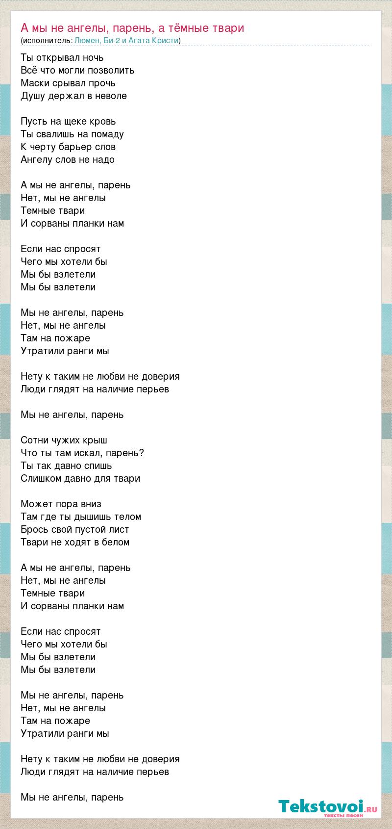 Ты открывал ночь Всё что могли позволить Маски срывал прочь Душу держал в неволе Пусть на щеке кровь Ты свалишь на помаду К черту барьер слов Ангелу слов не надо А мы не ангелы, парень Нет, мы не ангелы Темные твари И сорваны планки нам Если нас спросят Чего мы хотели бы Мы бы взлетели Мы бы взлетели Мы не ангелы, парень Нет, мы не ангелы Там на пожаре Утратили ранги мы Нету к таким не любви не доверия Люди глядят на наличие перьев Мы не ангелы, парень Сотни чужих крыш Что ты там искал, парень? Ты так давно спишь Слишком давно для твари Может пора вниз Там где ты дышишь телом Брось свой пустой лист Твари не ходят в белом А мы не ангелы, парень Нет, мы не ангелы Темные твари И сорваны планки нам Если нас спросят Чего мы хотели бы Мы бы взлетели Мы бы взлетели Мы не ангелы, парень Нет, мы не ангелы Там на пожаре Утратили ранги мы Нету к таким не любви не доверия Люди глядят на наличие перьев Мы не ангелы, парень