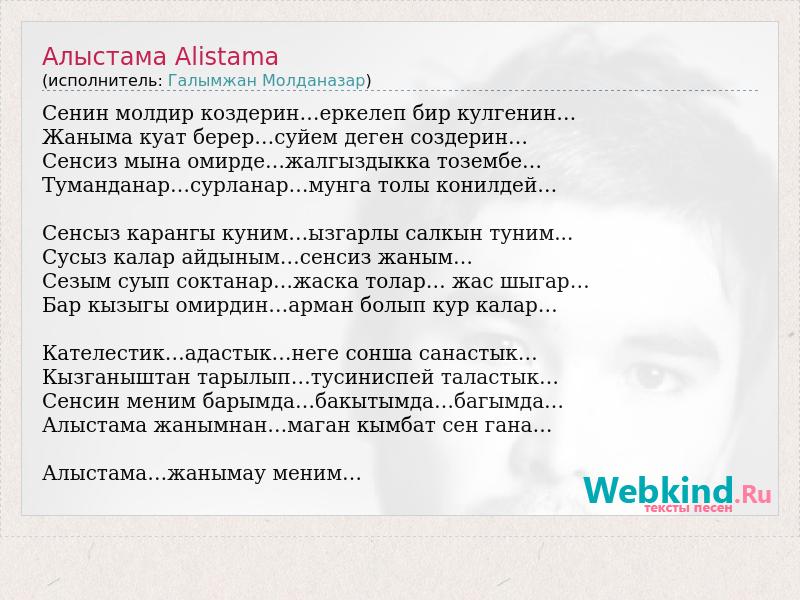 Сенин молдир коздерин…еркелеп бир кулгенин… Жаныма куат берер…суйем деген создерин… Сенсиз мына омирде…жалгыздыкка тозембе… Туманданар…сурланар…мунга толы конилдей… Сенсыз карангы куним…ызгарлы салкын туним... Сусыз калар айдыным…сенсиз жаным… Сезым суып соктанар…жаска толар… жас шыгар… Бар кызыгы омирдин…арман болып кур калар… Кателестик…адастык…неге сонша санастык… Кызганыштан тарылып…тусиниспей таластык… Сенсин меним барымда…бакытымда…багымда… Алыстама жанымнан…маган кымбат сен гана… Алыстама…жанымау меним…