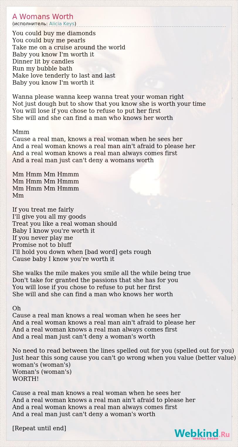 You could buy me diamonds You could buy me pearls Take me on a cruise around the world Baby you know I'm worth it Dinner lit by candles Run my bubble bath Make love tenderly to last and last Baby you know I'm worth it Wanna please wanna keep wanna treat your woman right Not just dough but to show that you know she is worth your time You will lose if you chose to refuse to put her first She will and she can find a man who knows her worth Mmm Cause a real man, knows a real woman when he sees her And a real woman knows a real man ain't afraid to please her And a real woman knows a real man always comes first And a real man just can't deny a womans worth Mm Hmm Mm Hmmm Mm Hmm Mm Hmmm Mm Hmm Mm Hmmm Mm If you treat me fairly I'll give you all my goods Treat you like a real woman should Baby I know you're worth it If you never play me Promise not to bluff I'll hold you down when [bad word] gets rough Cause baby I know you're worth it She walks the mile makes you smile all the while being true Don't take for granted the passions that she has for you You will lose if you chose to refuse to put her first She will and she can find a man who knows her worth Oh Cause a real man knows a real woman when he sees her And a real woman knows a real man ain't afraid to please her And a real woman knows a real man always comes first And a real man just can't deny a woman's worth No need to read between the lines spelled out for you (spelled out for you) Just hear this song cause you can't go wrong when you value (better value) woman's (woman's) Woman's (woman's) WORTH! Cause a real man knows a real woman when he sees her And a real woman knows a real man ain't afraid to please her And a real woman knows a real man always comes first And a real man just can't deny a woman's worth [Repeat until end]
