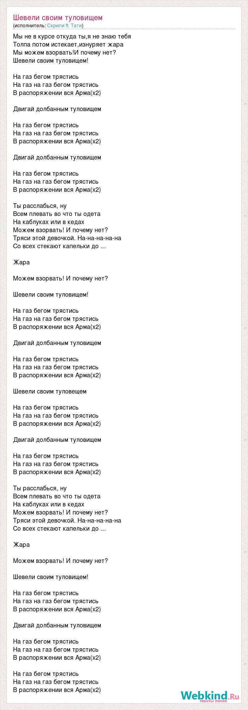 Мы не в курсе откуда ты,я не знаю тебя Толпа потом истекает,изнуряет жара Мы можем взорвать!И почему нет? Шевели своим туловищем! На газ бегом трястись На газ на газ бегом трястись В распоряжении вся Арма(x2) Двигай долбанным туловищем На газ бегом трястись На газ на газ бегом трястись В распоряжении вся Арма(x2) Двигай долбанным туловищем На газ бегом трястись На газ на газ бегом трястись В распоряжении вся Арма(x2) Ты расслабься, ну Всем плевать во что ты одета На каблуках или в кедах Можем взорвать! И почему нет? Тряси этой девочкой. На-на-на-на-на Со всех стекают капельки до ... Жара Можем взорвать! И почему нет? Шевели своим туловищем! На газ бегом трястись На газ на газ бегом трястись В распоряжении вся Арма(x2) Двигай долбанным туловищем На газ бегом трястись На газ на газ бегом трястись В распоряжении вся Арма(x2) Шевели своим туловещем На газ бегом трястись На газ на газ бегом трястись В распоряжении вся Арма(x2) Двигай долбанным туловищем На газ бегом трястись На газ на газ бегом трястись В распоряжении вся Арма(x2) Ты расслабься, ну Всем плевать во что ты одета На каблуках или в кедах Можем взорвать! И почему нет? Тряси этой девочкой. На-на-на-на-на Со всех стекают капельки до ... Жара Можем взорвать! И почему нет? Шевели своим туловищем! На газ бегом трястись На газ на газ бегом трястись В распоряжении вся Арма(x2) Двигай долбанным туловищем На газ бегом трястись На газ на газ бегом трястись В распоряжении вся Арма(x2) На газ бегом трястись На газ на газ бегом трястись В распоряжении вся Арма(x2)