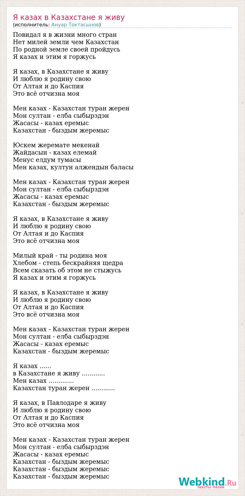 Повидал я в жизни много стран Нет милей земли чем Казахстан По родной земле своей пройдусь Я казах и этим я горжусь Я казах, в Казахстане я живу И люблю я родину свою От Алтая и до Каспия Это всё отчизна моя Мен казах - Казахстан туран жерен Мон султан - елба сыбырздэн Жасасы - казах еремыс Казахстан - быздым жеремыс Юскем жеремате мекенай Жайдасын - казах елемай Менус елдум тумасы Мен казах, култун алжендын баласы Мен казах - Казахстан туран жерен Мон султан - елба сыбырздэн Жасасы - казах еремыс Казахстан - быздым жеремыс Я казах, в Казахстане я живу И люблю я родину свою От Алтая и до Каспия Это всё отчизна моя Милый край - ты родина моя Хлебом - степь бескрайняя щедра Всем сказать об этом не стыжусь Я казах и этим я горжусь Я казах, в Казахстане я живу И люблю я родину свою От Алтая и до Каспия Это всё отчизна моя Мен казах - Казахстан туран жерен Мон султан - елба сыбырздэн Жасасы - казах еремыс Казахстан - быздым жеремыс Я казах ...... в Казахстане я живу ............ Мен казах ............. Казахстан туран жерен ............ Я казах, в Павлодаре я живу И люблю я родину свою От Алтая и до Каспия Это всё отчизна моя Мен казах - Казахстан туран жерен Мон султан - елба сыбырздэн Жасасы - казах еремыс Казахстан - быздым жеремыс Казахстан - быздым жеремыс Казахстан - быздым жеремыс