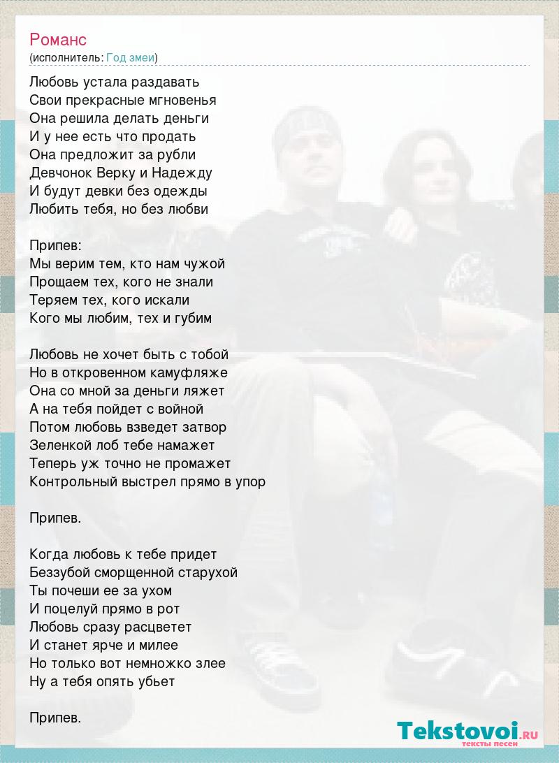Любовь устала раздавать Свои прекрасные мгновенья Она решила делать деньги И у нее есть что продать Она предложит за рубли Девчонок Верку и Надежду И будут девки без одежды Любить тебя, но без любви Припев: Мы верим тем, кто нам чужой Прощаем тех, кого не знали Теряем тех, кого искали Кого мы любим, тех и губим Любовь не хочет быть с тобой Но в откровенном камуфляже Она со мной за деньги ляжет А на тебя пойдет с войной Потом любовь взведет затвор Зеленкой лоб тебе намажет Теперь уж точно не промажет Контрольный выстрел прямо в упор Припев. Когда любовь к тебе придет Беззубой сморщенной старухой Ты почеши ее за ухом И поцелуй прямо в рот Любовь сразу расцветет И станет ярче и милее Но только вот немножко злее Ну а тебя опять убьет Припев.