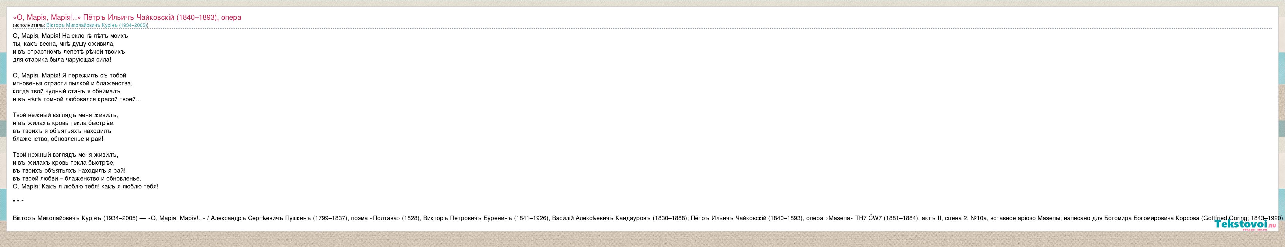 О, Марiя, Марiя! На склонѣ лѣтъ моихъ ты, какъ весна, мнѣ душу оживила, и въ страстномъ лепетѣ рѣчей твоихъ для старика была чарующая сила! О, Марiя, Марiя! Я пережилъ съ тобой мгновенья страсти пылкой и блаженства, когда твой чудный станъ я обнималъ и въ нѣгѣ томной любовался красой твоей… Твой нежный взглядъ меня живилъ, и въ жилахъ кровь текла быстрѣе, въ твоихъ я объятьяхъ находилъ блаженство, обновленье и рай! Твой нежный взглядъ меня живилъ, и въ жилахъ кровь текла быстрѣе, въ твоихъ объятьяхъ находилъ я рай! въ твоей любви – блаженство и обновленье. О, Марiя! Какъ я люблю тебя! какъ я люблю тебя! * * * Вікторъ Миколайовичъ Курінъ (1934–2005) — «О, Марiя, Марiя!..» / Александръ Сергѣевичъ Пушкинъ (1799–1837), поэма «Полтава» (1828), Викторъ Петровичъ Буренинъ (1841–1926), Василій Алексѣевичъ Кандауровъ (1830–1888); Пётръ Ильичъ Чайковскій (1840–1893), опера «Мазепа» TH7 ČW7 (1881–1884), актъ II, сцена 2, №10а, вставное арiозо Мазепы; написано для Богомира Богомировича Корсова (Gottfried Göring; 1843–1920).