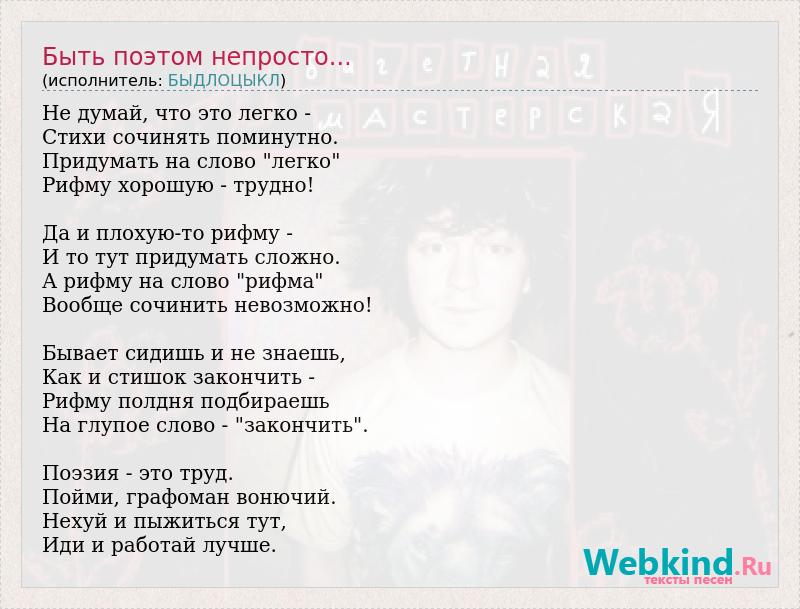 Не думай, что это легко - Стихи сочинять поминутно. Придумать на слово "легко" Рифму хорошую - трудно! Да и плохую-то рифму - И то тут придумать сложно. А рифму на слово "рифма" Вообще сочинить невозможно! Бывает сидишь и не знаешь, Как и стишок закончить - Рифму полдня подбираешь На глупое слово - "закончить". Поэзия - это труд. Пойми, графоман вонючий. Нехуй и пыжиться тут, Иди и работай лучше.