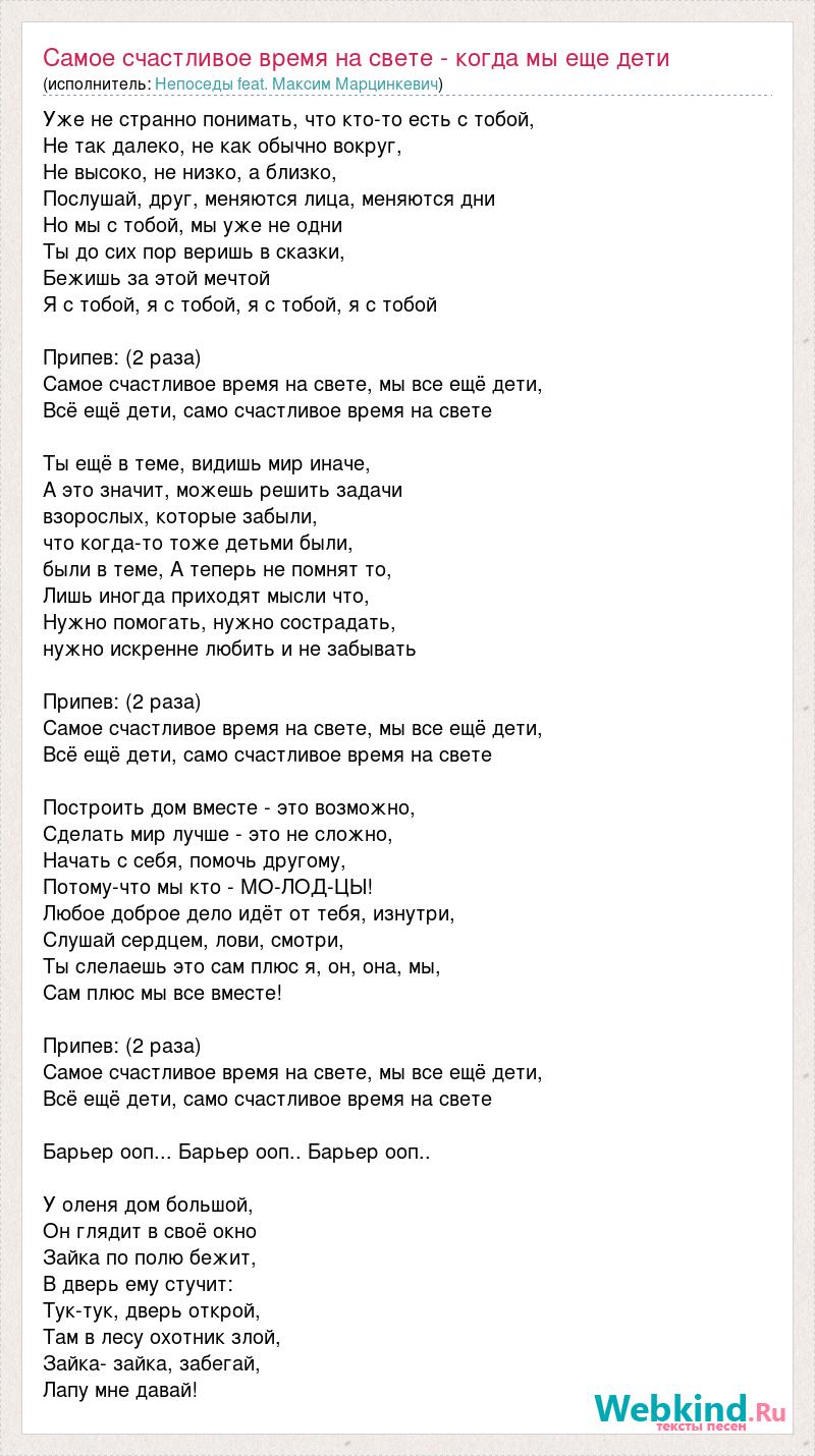 Уже не странно понимать, что кто-то есть с тобой, Не так далеко, не как обычно вокруг, Не высоко, не низко, а близко, Послушай, друг, меняются лица, меняются дни Но мы с тобой, мы уже не одни Ты до сих пор веришь в сказки, Бежишь за этой мечтой Я с тобой, я с тобой, я с тобой, я с тобой Припев: (2 раза) Самое счастливое время на свете, мы все ещё дети, Всё ещё дети, само счастливое время на свете Ты ещё в теме, видишь мир иначе, А это значит, можешь решить задачи взорослых, которые забыли, что когда-то тоже детьми были, были в теме, А теперь не помнят то, Лишь иногда приходят мысли что, Нужно помогать, нужно сострадать, нужно искренне любить и не забывать Припев: (2 раза) Самое счастливое время на свете, мы все ещё дети, Всё ещё дети, само счастливое время на свете Построить дом вместе - это возможно, Сделать мир лучше - это не сложно, Начать с себя, помочь другому, Потому-что мы кто - МО-ЛОД-ЦЫ! Любое доброе дело идёт от тебя, изнутри, Слушай сердцем, лови, смотри, Ты слелаешь это сам плюс я, он, она, мы, Сам плюс мы все вместе! Припев: (2 раза) Самое счастливое время на свете, мы все ещё дети, Всё ещё дети, само счастливое время на свете Барьер ооп... Барьер ооп.. Барьер ооп.. У оленя дом большой, Он глядит в своё окно Зайка по полю бежит, В дверь ему стучит: Тук-тук, дверь открой, Там в лесу охотник злой, Зайка- зайка, забегай, Лапу мне давай!
