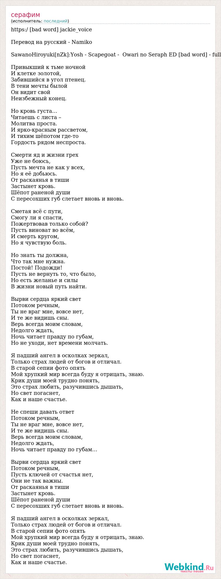 https:/ [bad word] jackie_voice Перевод на русский - Namiko SawanoHiroyuki[nZk]:Yosh - Scapegoat - Owari no Seraph ED [bad word] - full Привыкший к тьме ночной И клетке золотой, Забившийся в угол птенец. В тени мечты былой Он видит свой Неизбежный конец. Но кровь густа… Читаешь с листа – Молитва проста. И ярко-красным рассветом, И тихим шёпотом где-то Гордость рядом неспроста. Смерти яд и жизни грех Уже не боюсь, Пусть мечта не как у всех, Но я её добьюсь. От раскаянья в тиши Застынет кровь. Шёпот раненой души С пересохших губ слетает вновь и вновь. Сметая всё с пути, Смогу ли я спасти, Пожертвовав только собой? Пусть виноват во всём, И смерть кругом, Но я чувствую боль. Но знать ты должна, Что так мне нужна. Постой! Подожди! Пусть не вернуть то, что было, Но есть желанье и силы В жизни новый путь найти. Вырви сердца яркий свет Потоком речным, Ты не враг мне, вовсе нет, И те же видишь сны. Верь всегда моим словам, Недолго ждать, Ночь читает правду по губам, Но не уходи, нет времени молчать. Я падший ангел в осколках зеркал, Только страх людей от богов и отличал. В старой сепии фото опять Мой хрупкий мир всегда буду я отрицать, знаю. Крик души моей трудно понять, Это страх любить, разучившись дышать, Но свет погаснет, Как и наше счастье. Не спеши давать ответ Потоком речным, Ты не враг мне, вовсе нет, И те же видишь сны. Верь всегда моим словам, Недолго ждать, Ночь читает правду по губам… Вырви сердца яркий свет Потоком речным, Пусть ключей от счастья нет, Они не так важны. От раскаянья в тиши Застынет кровь. Шёпот раненой души С пересохших губ слетает вновь и вновь. Я падший ангел в осколках зеркал, Только страх людей от богов и отличал. В старой сепии фото опять Мой хрупкий мир всегда буду я отрицать, знаю. Крик души моей трудно понять, Это страх любить, разучившись дышать, Но свет погаснет, Как и наше счастье.