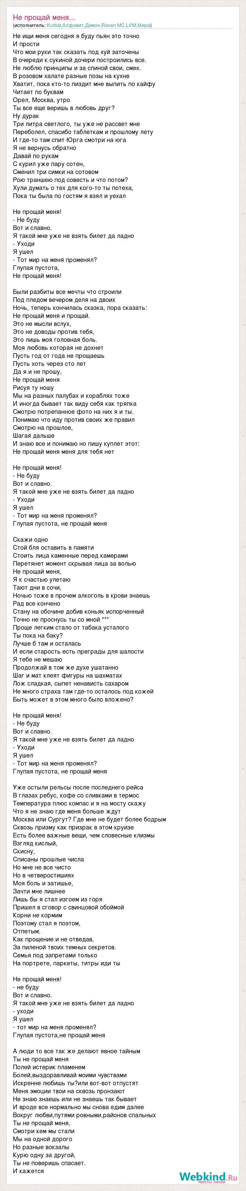Не ищи меня сегодня я буду пьян это точно И прости Что мои руки так сказать под хуй заточены В очереди к сукиной дочери построились все. Не люблю принципы и за спиной свои, смех. В розовом халате разные позы на кухне Хватит, пока кто-то пиздит мне выпить по кайфу Читает по буквам Орел, Москва, утро Ты все еще веришь в любовь друг? Ну дурак Три литра светлого, ты уже не рассвет мне Переболел, спасибо таблеткам и прошлому лету И где-то там спит Юрга смотри на юга Я не вернусь обратно Давай по рукам С курил уже пару сотен, Сменил три симки на сотовом Рою траншею под совесть и что потом? Хули думать о тех для кого-то ты потеха, Пока ты была по гостям я взял и уехал Не прощай меня! - Не буду Вот и славно. Я такой мне уже не взять билет да ладно - Уходи Я ушел - Тот мир на меня променял? Глупая пустота, Не прощай меня! Были разбиты все мечты что строили Под пледом вечером деля на двоих Ночь, теперь кончилась сказка, пора сказать: Не прощай меня и прощай. Это не мысли вслух, Это не доводы против тебя, Это лишь моя головная боль. Моя любовь которая не дохнет Пусть год от года не прощаешь Пусть хоть через сто лет Да я и не прошу, Не прощай меня Рисуя ту ношу Мы на разных палубах и кораблях тоже И иногда бывает так виду себя как тряпка Смотрю потрепанное фото на них я и ты. Понимаю что иду против своих же правил Смотрю на прошлое, Шагая дальше И знаю все и понимаю но пишу куплет этот: Не прощай меня меня для тебя нет Не прощай меня! - Не буду Вот и славно. Я такой мне уже не взять билет да ладно - Уходи Я ушел - Тот мир на меня променял? Глупая пустота, не прощай меня Скажи одно Стой бля оставить в памяти Стоить лица каменные перед камерами Перетянет момент скрывая лица за волью Не прощай меня, Я к счастью улетаю Тают дни в сочи, Ночью тоже в прочем алкоголь в крови знаешь Рад все кончено Стану на обочине добив коньяк испорченный Точно не проснусь ты со мной *** Проще легким стало от табака усталого Ты пока на баку? Лучше б там и осталась И если старость есть преграды для шалости Я тебе не мешаю Продолжай в том же духе ушатанно Шаг и мат клеят фигуры на шахматах Лож сладкая, сыпет ненависть сахаром Не много страха там где-то осталось под кожей Быть может в этом много было вложено? Не прощай меня! - Не буду Вот и славно. Я такой мне уже не взять билет да ладно - Уходи Я ушел - Тот мир на меня променял? Глупая пустота, не прощай меня Уже остыли рельсы после последнего рейса В глазах ребус, кофе со сливками в термос Температура плюс компас и я на мосту скажу Что я не знаю где меня больше ждут Москва или Сургут? Где мне не будет более бодрым Сквозь призму как призрак в этом круизе Есть более важные вещи, чем словесные клизмы Взгляд кислый, Скисну, Списаны прошлые числа Но мне не все чисто Но в четверостишиях Моя боль и затишье, Зачти мне лишнее Лишь бы я стал изгоем из горя Пришел в сговор с свинцовой обоймой Корни не кормим Поэтому стал я поэтом, Отпетым. Как прощение и не отведав, За пиленой твоих темных секретов. Семья под запретами только На портрете, паркеты, титры иди ты Не прощай меня! - не буду Вот и славно. Я такой мне уже не взять билет да ладно - уходи Я ушел - тот мир на меня променял? Глупая пустота,не прощай меня А люди то все так же делают явное тайным Ты не прощай меня Полей истерик пламенем Болей,выздоравливай моими чувствами Искренне любишь ты?или вот-вот отпустят Меня эмоции твои на скво