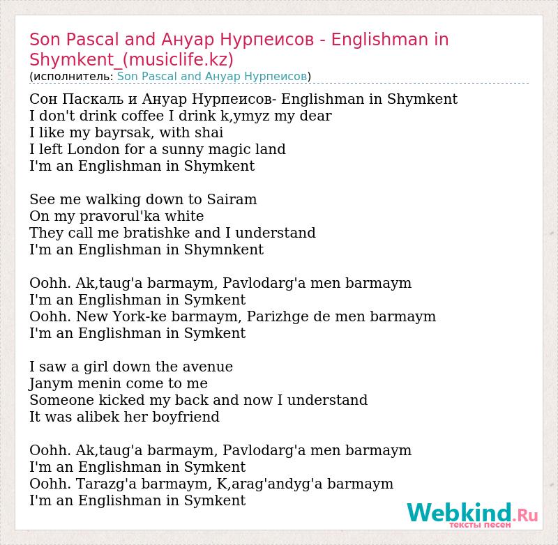 Сон Паскаль и Ануар Нурпеисов- Englishman in Shymkent I don't drink coffee I drink k,ymyz my dear I like my bayrsak, with shai I left London for a sunny magic land I'm an Englishman in Shymkent See me walking down to Sairam On my pravorul'ka white They call me bratishke and I understand I'm an Englishman in Shymnkent Oohh. Ak,taug'a barmaym, Pavlodarg'a men barmaym I'm an Englishman in Symkent Oohh. New York-ke barmaym, Parizhge de men barmaym I'm an Englishman in Symkent I saw a girl down the avenue Janym menin come to me Someone kicked my back and now I understand It was alibek her boyfriend Oohh. Ak,taug'a barmaym, Pavlodarg'a men barmaym I'm an Englishman in Symkent Oohh. Tarazg'a barmaym, K,arag'andyg'a barmaym I'm an Englishman in Symkent