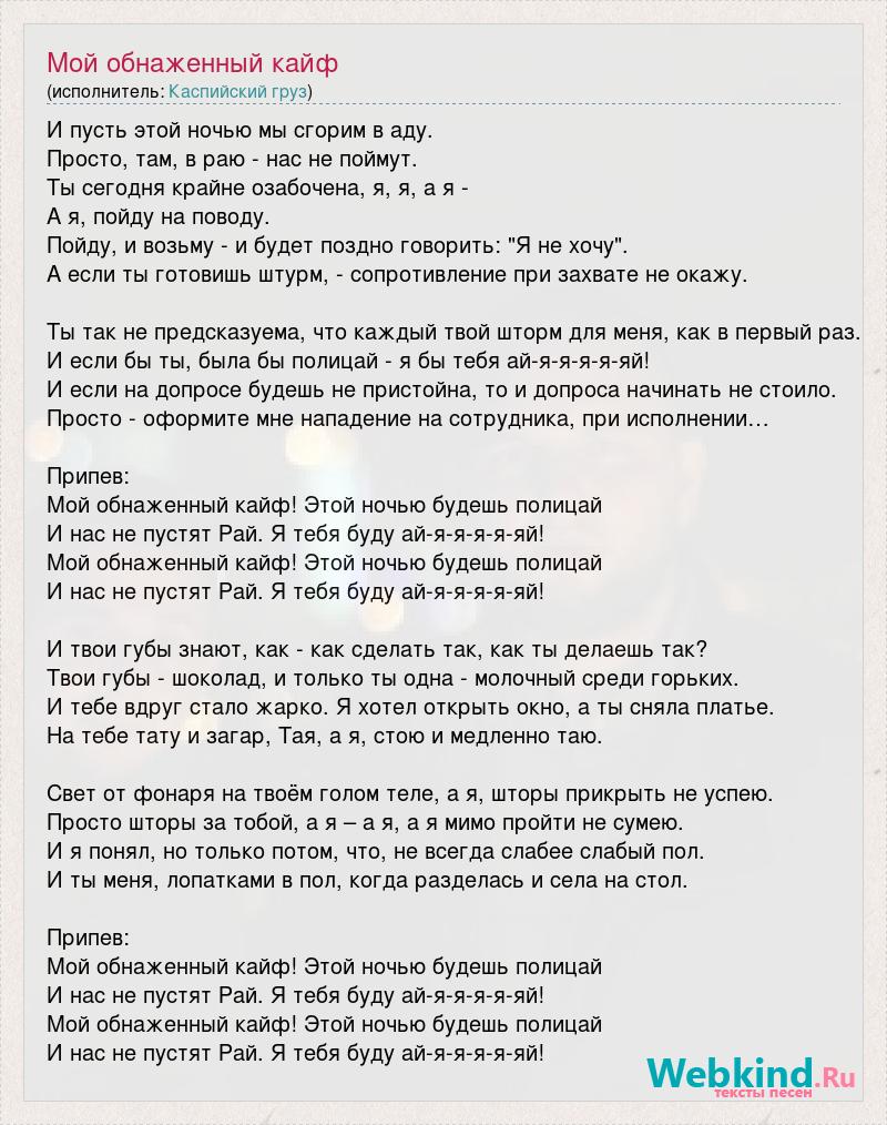 И пусть этой ночью мы сгорим в аду. Просто, там, в раю - нас не поймут. Ты сегодня крайне озабочена, я, я, а я - А я, пойду на поводу. Пойду, и возьму - и будет поздно говорить: "Я не хочу". А если ты готовишь штурм, - сопротивление при захвате не окажу. Ты так не предсказуема, что каждый твой шторм для меня, как в первый раз. И если бы ты, была бы полицай - я бы тебя ай-я-я-я-я-яй! И если на допросе будешь не пристойна, то и допроса начинать не стоило. Просто - оформите мне нападение на сотрудника, при исполнении… Припев: Мой обнаженный кайф! Этой ночью будешь полицай И нас не пустят Рай. Я тебя буду ай-я-я-я-я-яй! Мой обнаженный кайф! Этой ночью будешь полицай И нас не пустят Рай. Я тебя буду ай-я-я-я-я-яй! И твои губы знают, как - как сделать так, как ты делаешь так? Твои губы - шоколад, и только ты одна - молочный среди горьких. И тебе вдруг стало жарко. Я хотел открыть окно, а ты сняла платье. На тебе тату и загар, Тая, а я, стою и медленно таю. Свет от фонаря на твоём голом теле, а я, шторы прикрыть не успею. Просто шторы за тобой, а я – а я, а я мимо пройти не сумею. И я понял, но только потом, что, не всегда слабее слабый пол. И ты меня, лопатками в пол, когда разделась и села на стол. Припев: Мой обнаженный кайф! Этой ночью будешь полицай И нас не пустят Рай. Я тебя буду ай-я-я-я-я-яй! Мой обнаженный кайф! Этой ночью будешь полицай И нас не пустят Рай. Я тебя буду ай-я-я-я-я-яй!