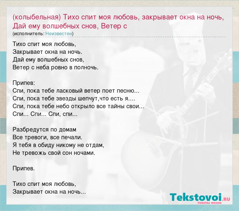Тихо спит моя любовь, Закрывает окна на ночь. Дай ему волшебных снов, Ветер с неба ровно в полночь. Припев: Спи, пока тебе ласковый ветер поет песню... Спи, пока тебе звезды шепчут,что есть я.... Спи, пока тебе небо открыло все тайны свои... Спи... Спи... Спи, спи... Разбредутся по домам Все тревоги, все печали. Я тебя в обиду никому не отдам, Не тревожь свой сон ночами. Припев. Тихо спит моя любовь, Закрывает окна на ночь...