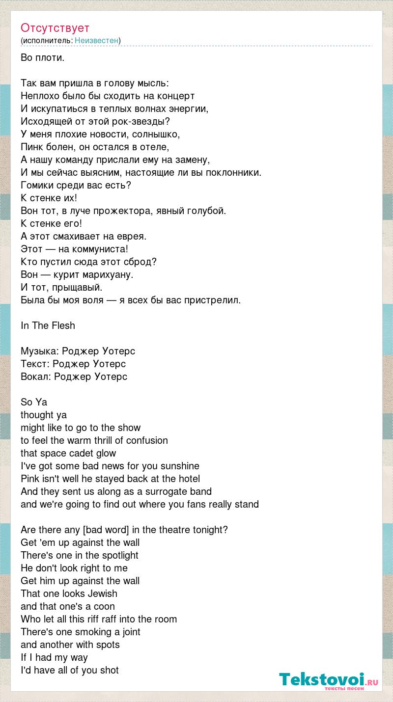Во плоти. Так вам пришла в голову мысль: Неплохо было бы сходить на концерт И искупатиься в теплых волнах энергии, Исходящей от этой рок-звезды? У меня плохие новости, солнышко, Пинк болен, он остался в отеле, А нашу команду прислали ему на замену, И мы сейчас выясним, настоящие ли вы поклонники. Гомики среди вас есть? К стенке их! Вон тот, в луче прожектора, явный голубой. К стенке его! А этот смахивает на еврея. Этот — на коммуниста! Кто пустил сюда этот сброд? Вон — курит марихуану. И тот, прыщавый. Была бы моя воля — я всех бы вас пристрелил. In The Flesh Музыка: Роджер Уотерс Текст: Роджер Уотерс Вокал: Роджер Уотерс So Ya thought ya might like to go to the show to feel the warm thrill of confusion that space cadet glow I've got some bad news for you sunshine Pink isn't well he stayed back at the hotel And they sent us along as a surrogate band and we're going to find out where you fans really stand Are there any [bad word] in the theatre tonight? Get 'em up against the wall There's one in the spotlight He don't look right to me Get him up against the wall That one looks Jewish and that one's a coon Who let all this riff raff into the room There's one smoking a joint and another with spots If I had my way I'd have all of you shot