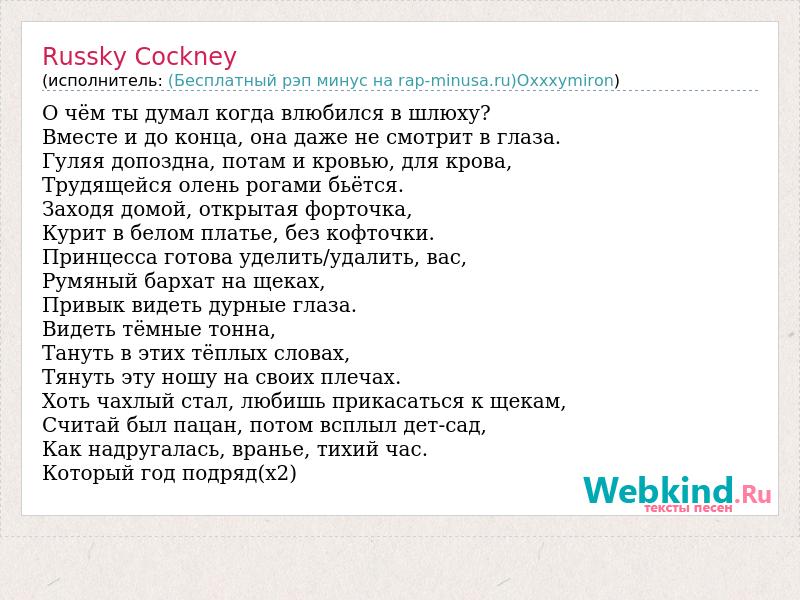 О чём ты думал когда влюбился в шлюху? Вместе и до конца, она даже не смотрит в глаза. Гуляя допоздна, потам и кровью, для крова, Трудящейся олень рогами бьётся. Заходя домой, открытая форточка, Курит в белом платье, без кофточки. Принцесса готова уделить/удалить, вас, Румяный бархат на щеках, Привык видеть дурные глаза. Видеть тёмные тонна, Тануть в этих тёплых словах, Тянуть эту ношу на своих плечах. Хоть чахлый стал, любишь прикасаться к щекам, Считай был пацан, потом всплыл дет-сад, Как надругалась, вранье, тихий час. Который год подряд(х2)