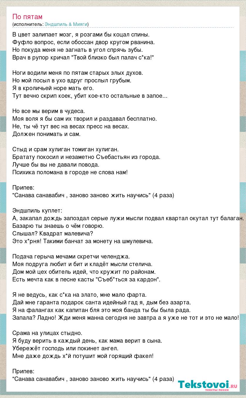 В цвет залипает мозг, я розгами бы коцал спины. Фуфло вопрос, если обоссан двор кругом рванина. Но покуда меня не загнать в угол спрячь зубы. Врач в рупор кричал "Твой близко был палач с*ка!" Ноги водили меня по пятам старых злых духов. Но мой посыл в ухо вдруг прослыл грубым. Я в кроличьей норе мать его. Тут вечно скрип коек, убит кое-кто остальные в запое... Но все мы верим в чудеса. Моя воля я бы сам их творил и раздавал бесплатно. Не, ты чё тут вес на весах пресс на весах. Должен понимать и сам. Стыд и срам хулиган томиган хулиган. Братату покосил и незаметно Съебастьян из города. Лучше бы вы не давали повода. Психика поломана в городе не слова нам! Припев: "Санава санавабич , заново заново жить научись" (4 раза) Эндшпиль куплет: А, закапал дождь запоздал серые лужи мысли подвал квартал окутал тут балаган. Базарю ты знаешь о чём говорю. Слышал? Квадрат малевича? Это х*рня! Такими банчат за монету на шмулевича. Подача герыча мечами скретчи челенджа. Моя подруга любит и бит и кладёт мысли стелича. Дом мой цех обитель идей, что кружит по районам. Есть мечта как в песне касты "Съеб*ться за кардон". Я не ведусь, как с*ка на злато, мне мало фарта. Дай мне гаранта подарок санта идейный гад я, дым без азарта. Я на фалангах как капитан бля это моя банда ты бы была рада. Запала? Ладно! Жди меня манна сегодня не завтра а я уже не тот и это не мало! Срама на улицах стыдно. Я буду верить в каждый день, как мама верит в сына. Убережёт господь или покинет ангел. Мне даже дождь х*й потушит мой горящий факел! Припев: "Санава санавабич , заново заново жить научись" (4 раза)