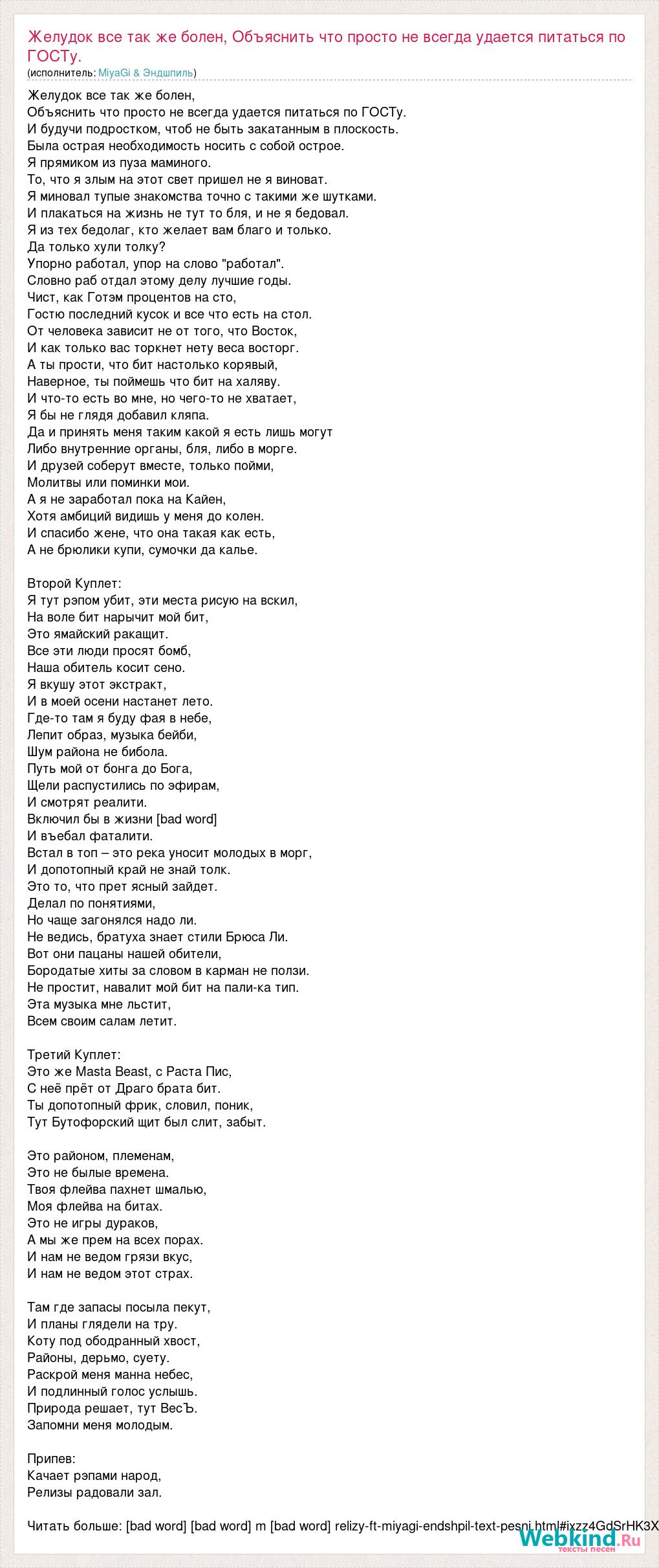 Желудок все так же болен, Объяснить что просто не всегда удается питаться по ГОСТу. И будучи подростком, чтоб не быть закатанным в плоскость. Была острая необходимость носить с собой острое. Я прямиком из пуза маминого. То, что я злым на этот свет пришел не я виноват. Я миновал тупые знакомства точно с такими же шутками. И плакаться на жизнь не тут то бля, и не я бедовал. Я из тех бедолаг, кто желает вам благо и только. Да только хули толку? Упорно работал, упор на слово "работал". Словно раб отдал этому делу лучшие годы. Чист, как Готэм процентов на сто, Гостю последний кусок и все что есть на стол. От человека зависит не от того, что Восток, И как только вас торкнет нету веса восторг. А ты прости, что бит настолько корявый, Наверное, ты поймешь что бит на халяву. И что-то есть во мне, но чего-то не хватает, Я бы не глядя добавил кляпа. Да и принять меня таким какой я есть лишь могут Либо внутренние органы, бля, либо в морге. И друзей соберут вместе, только пойми, Молитвы или поминки мои. А я не заработал пока на Кайен, Хотя амбиций видишь у меня до колен. И спасибо жене, что она такая как есть, А не брюлики купи, сумочки да калье. Второй Куплет: Я тут рэпом убит, эти места рисую на вскил, На воле бит нарычит мой бит, Это ямайский ракащит. Все эти люди просят бомб, Наша обитель косит сено. Я вкушу этот экстракт, И в моей осени настанет лето. Где-то там я буду фая в небе, Лепит образ, музыка бейби, Шум района не бибола. Путь мой от бонга до Бога, Щели распустились по эфирам, И смотрят реалити. Включил бы в жизни [bad word] И въебал фаталити. Встал в топ – это река уносит молодых в морг, И допотопный край не знай толк. Это то, что прет ясный зайдет. Делал по понятиями, Но чаще загонялся надо ли. Не ведись, братуха знает стили Брюса Ли. Вот они пацаны нашей обители, Бородатые хиты за словом в карман не ползи. Не простит, навалит мой бит на пали-ка тип. Эта музыка мне льстит, Всем своим салам летит. Третий Куплет: Это же Masta Beast, с Раста Пис, С неё прёт от Драго брата бит. Ты допотопный фрик, словил, поник, Тут Бутофорский щит был слит, забыт. Это районом, племенам, Это не былые времена. Твоя флейва пахнет шмалью, Моя флейва на битах. Это не игры дураков, А мы же прем на всех порах. И нам не ведом грязи вкус, И нам не ведом этот страх. Там где запасы посыла пекут, И планы глядели на тру. Коту под ободранный хвост, Районы, дерьмо, суету. Раскрой меня манна небес, И подлинный голос услышь. Природа решает, тут ВесЪ. Запомни меня молодым. Припев: Качает рэпами народ, Релизы радовали зал. Читать больше: [bad word] [bad word] m [bad word] relizy-ft-miyagi-endshpil-text-pesni.html#ixzz4GdSrHK3X