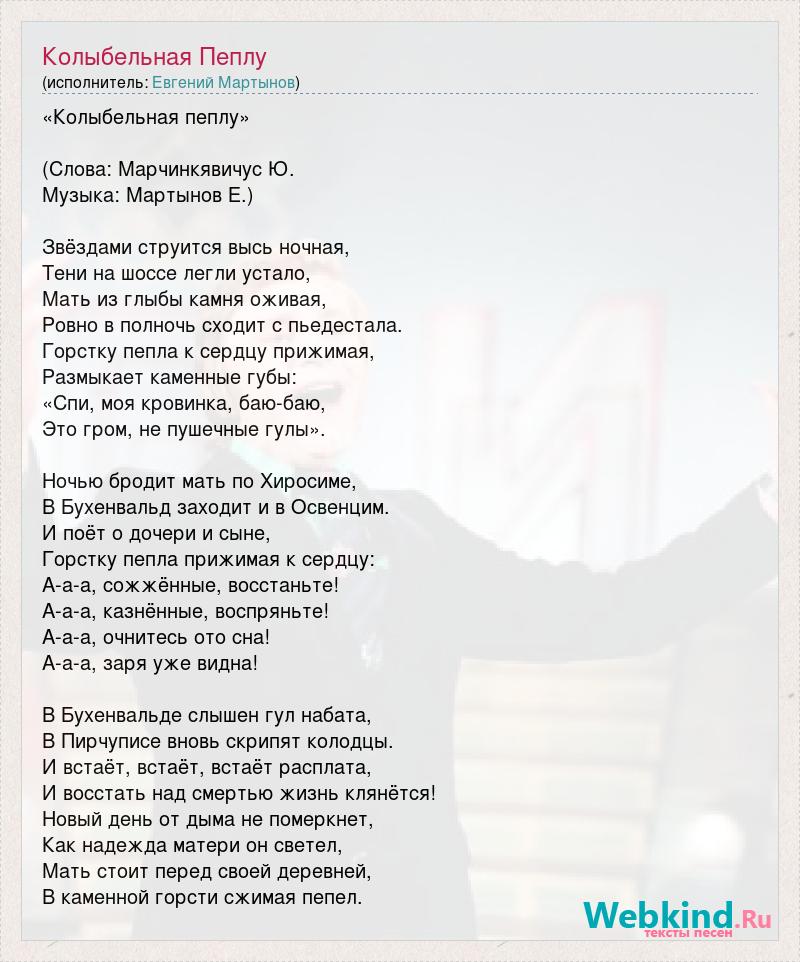 «Колыбельная пеплу» (Слова: Марчинкявичус Ю. Музыка: Мартынов Е.) Звёздами струится высь ночная, Тени на шоссе легли устало, Мать из глыбы камня оживая, Ровно в полночь сходит с пьедестала. Горстку пепла к сердцу прижимая, Размыкает каменные губы: «Спи, моя кровинка, баю-баю, Это гром, не пушечные гулы». Ночью бродит мать по Хиросиме, В Бухенвальд заходит и в Освенцим. И поёт о дочери и сыне, Горстку пепла прижимая к сердцу: А-а-а, сожжённые, восстаньте! А-а-а, казнённые, воспряньте! А-а-а, очнитесь ото сна! А-а-а, заря уже видна! В Бухенвальде слышен гул набата, В Пирчуписе вновь скрипят колодцы. И встаёт, встаёт, встаёт расплата, И восстать над смертью жизнь клянётся! Новый день от дыма не померкнет, Как надежда матери он светел, Мать стоит перед своей деревней, В каменной горсти сжимая пепел.
