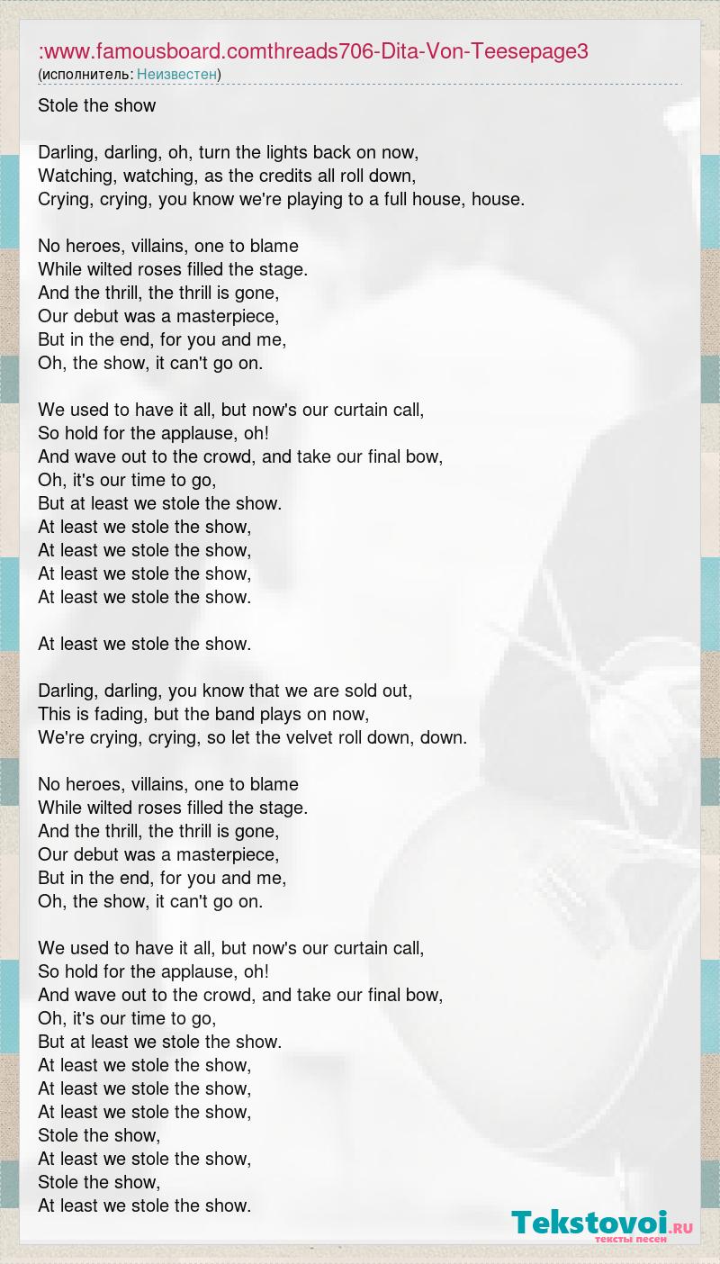 Stole the show Darling, darling, oh, turn the lights back on now, Watching, watching, as the credits all roll down, Crying, crying, you know we're playing to a full house, house. No heroes, villains, one to blame While wilted roses filled the stage. And the thrill, the thrill is gone, Our debut was a masterpiece, But in the end, for you and me, Oh, the show, it can't go on. We used to have it all, but now's our curtain call, So hold for the applause, oh! And wave out to the crowd, and take our final bow, Oh, it's our time to go, But at least we stole the show. At least we stole the show, At least we stole the show, At least we stole the show, At least we stole the show. At least we stole the show. Darling, darling, you know that we are sold out, This is fading, but the band plays on now, We're crying, crying, so let the velvet roll down, down. No heroes, villains, one to blame While wilted roses filled the stage. And the thrill, the thrill is gone, Our debut was a masterpiece, But in the end, for you and me, Oh, the show, it can't go on. We used to have it all, but now's our curtain call, So hold for the applause, oh! And wave out to the crowd, and take our final bow, Oh, it's our time to go, But at least we stole the show. At least we stole the show, At least we stole the show, At least we stole the show, Stole the show, At least we stole the show, Stole the show, At least we stole the show.